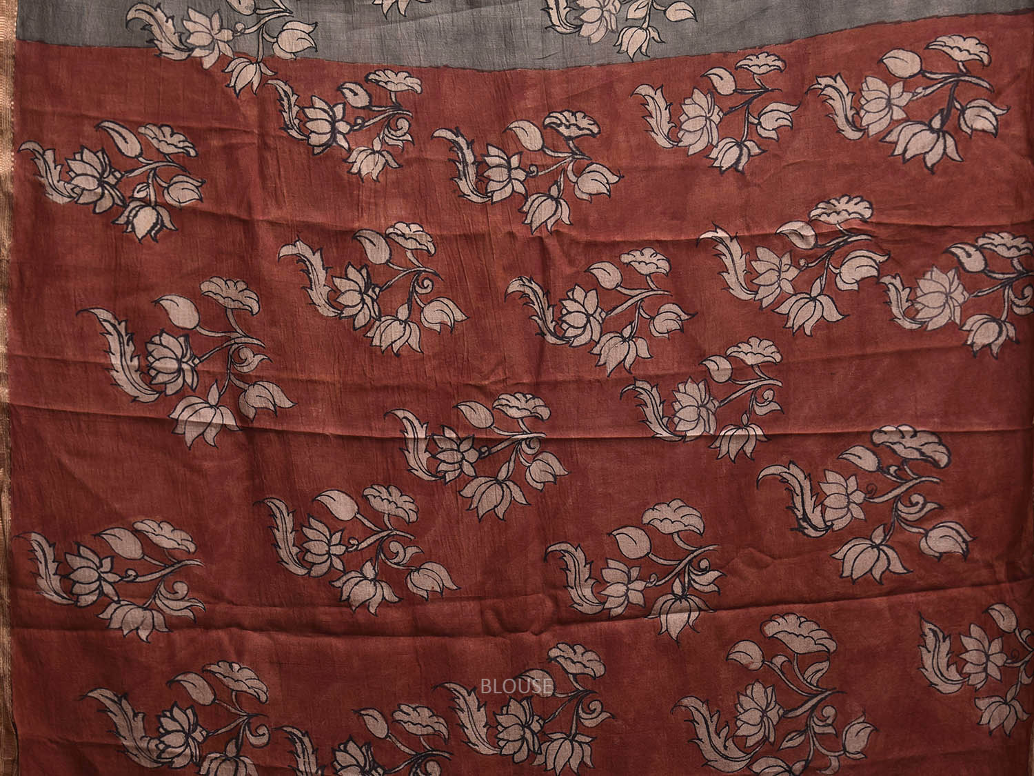 Grey and Red Kalamkari Hand Painted Muga Silk Handloom Saree with Floral and Mythological Design KL0839