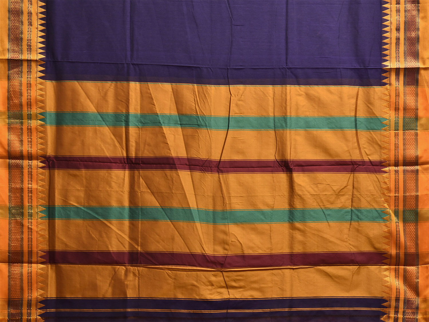 Indigo and Yellow ilkal Cotton Viscose Plain Saree with Strips Pallu Design. For fabric care we advise gentle handwash separately.