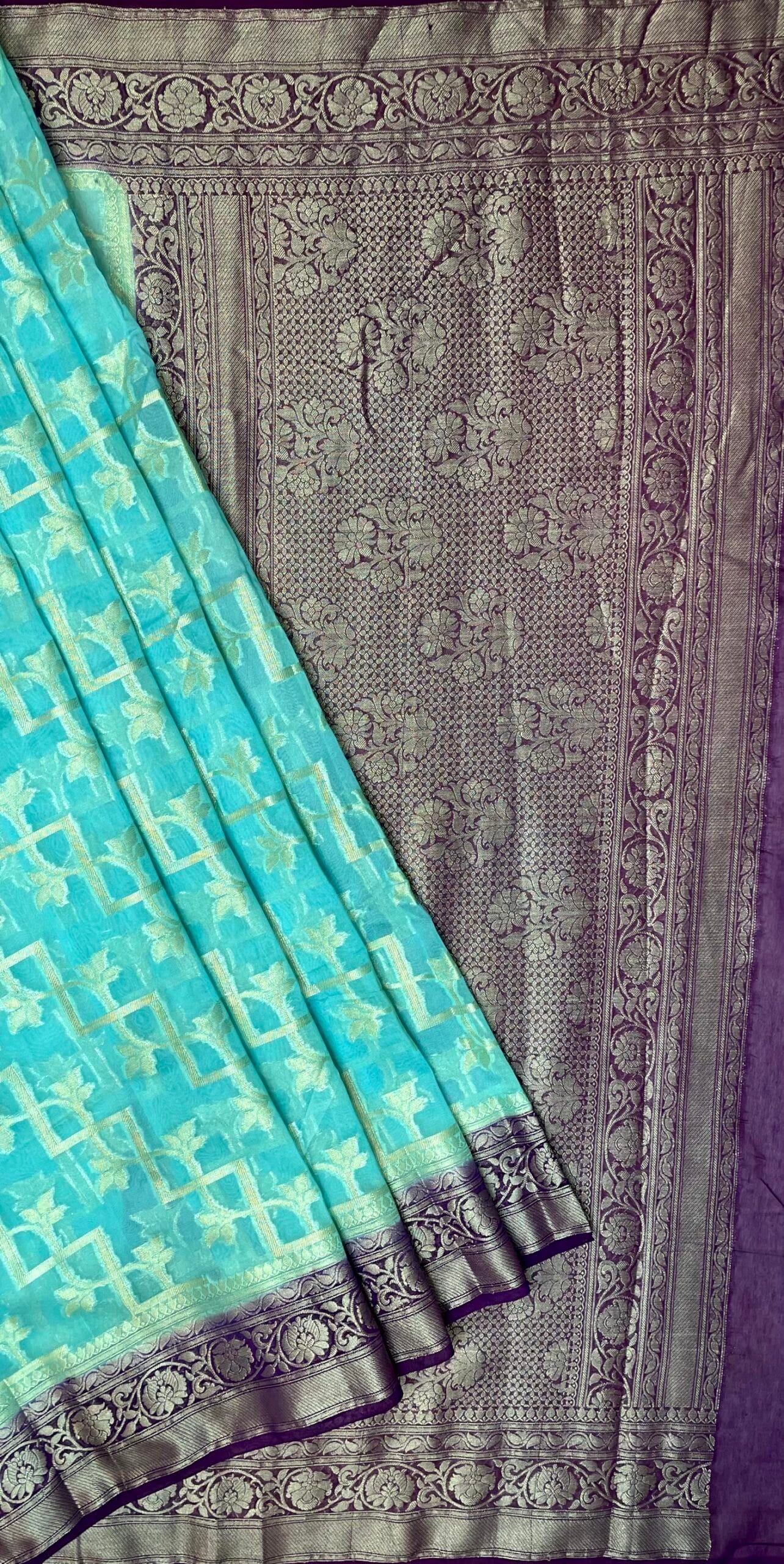 Light Blue and Magenta Black Banaras Georgette with Body Border and Pallu Design
