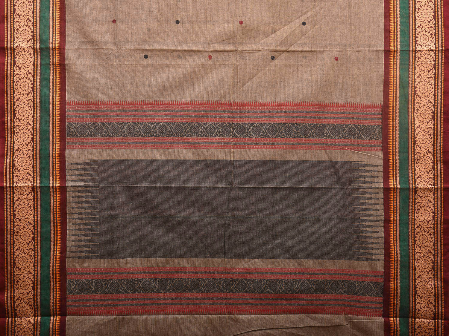 Light Grey Kanchipuram Cotton Saree with Buta and Floral Border Design, 80s count of compact combed cotton yarn is used in warp and weft for greater finish and long lasting. Traditional Simple South Indian Attire Saree for any Casual Occasions. As it’s a cotton saree we advise gentle hand wash separately for fabric care.