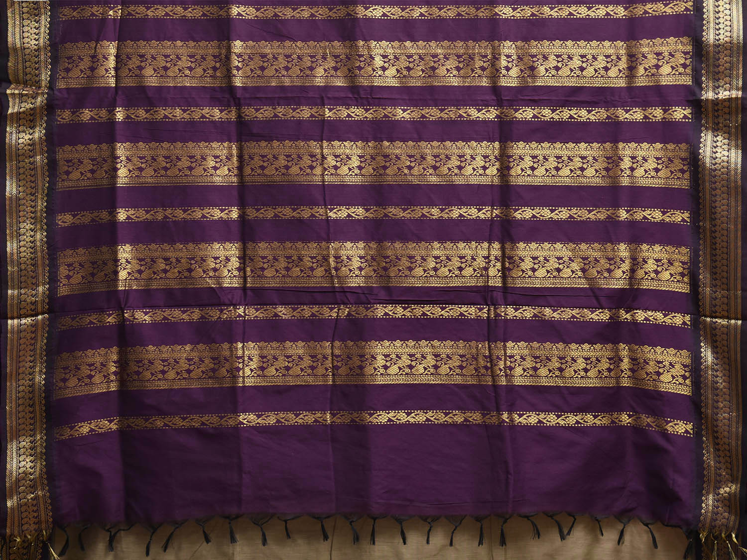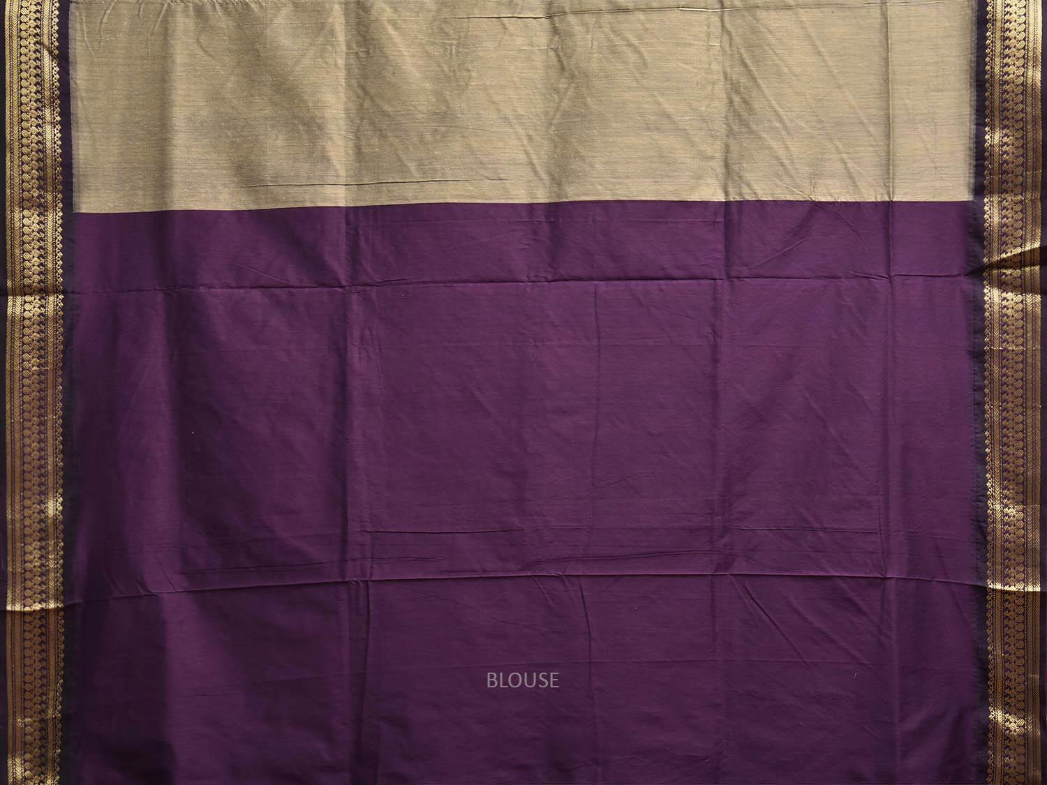 Light Khaki and Purple Gadwal Cotton Viscose Saree with Small Buta and Pallu Design. Gadwal Sarees are known for their tradtional design of border and pallu made of silk and body being either cotton or silk. They are known as Sico sarees for border and pallu being silk and body being cotton. We advice dry clean for fabric care.