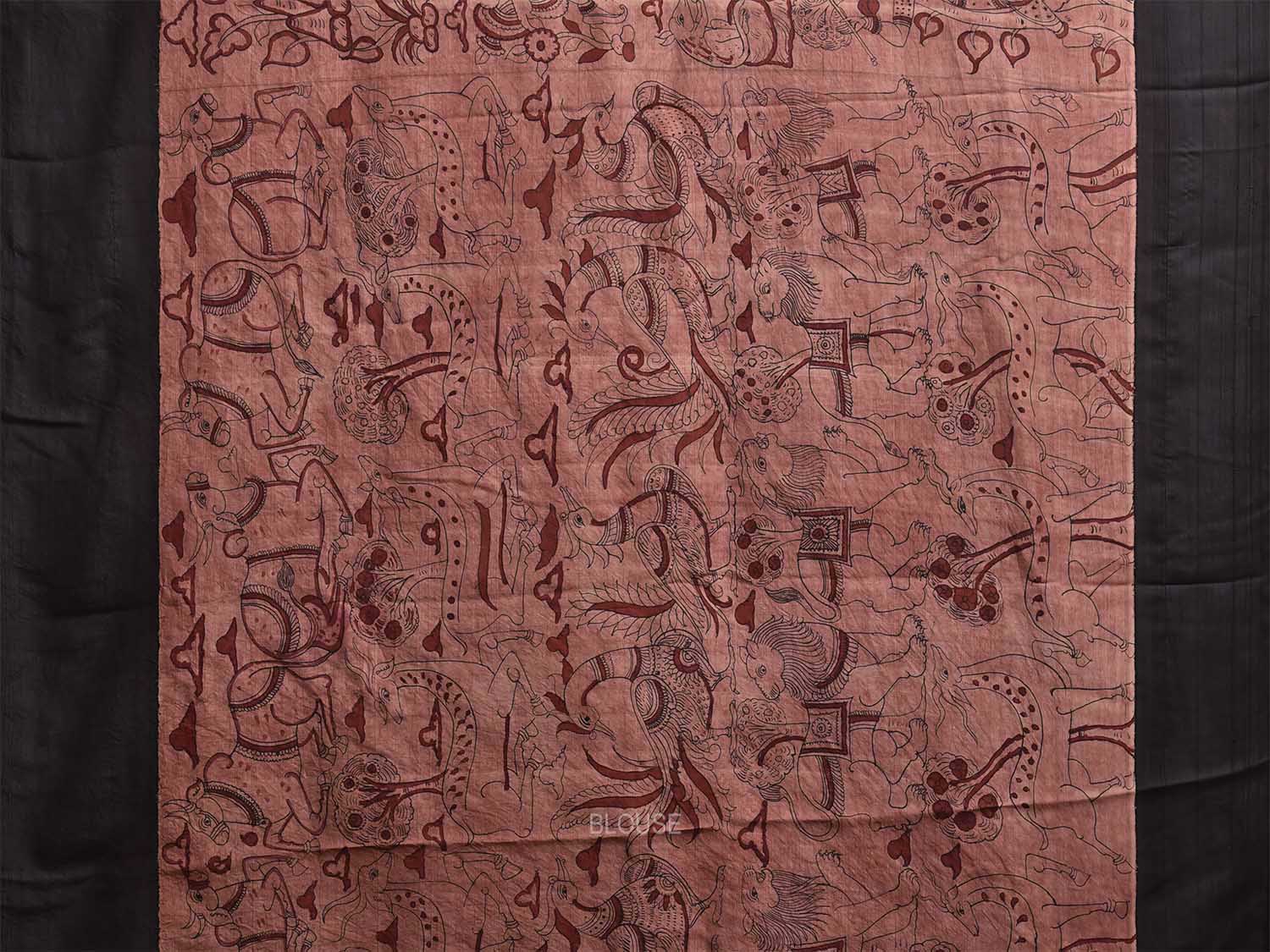 Light Pink and Black Kalamkari Hand Painted Gadwal Silk Handloom Saree with Animals and Village Theme Design. This hand painted kalamkari is done using natural dyes. As they are natural colors they bleed with initial washes, so we suggest Dry clean.