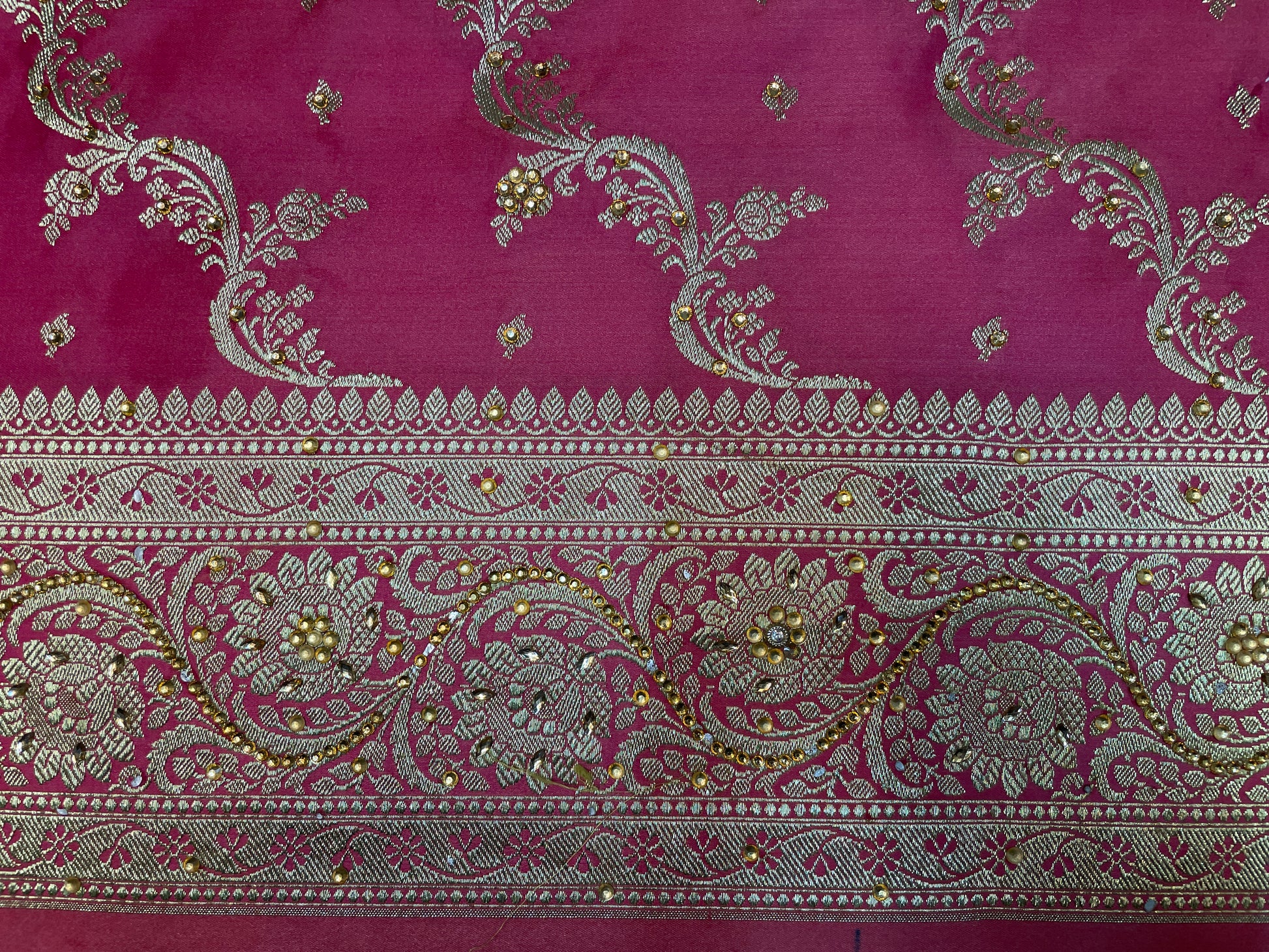 Drape yourself in timeless elegance with this exquisite emerald green Banarasi silk saree, adorned with delicate silver zari motifs throughout the body. The saree features an intricately woven floral and paisley border, complemented by a regal pallu with detailed brocade craftsmanship that reflects the rich heritage of Banaras.Perfect for weddings, festive occasions, and grand celebrations, this saree brings together tradition and luxury in every drape. The lustrous silk fabric adds a graceful fall and sheen, while the silver zari creates a stunning contrast that enhances its royal charm.