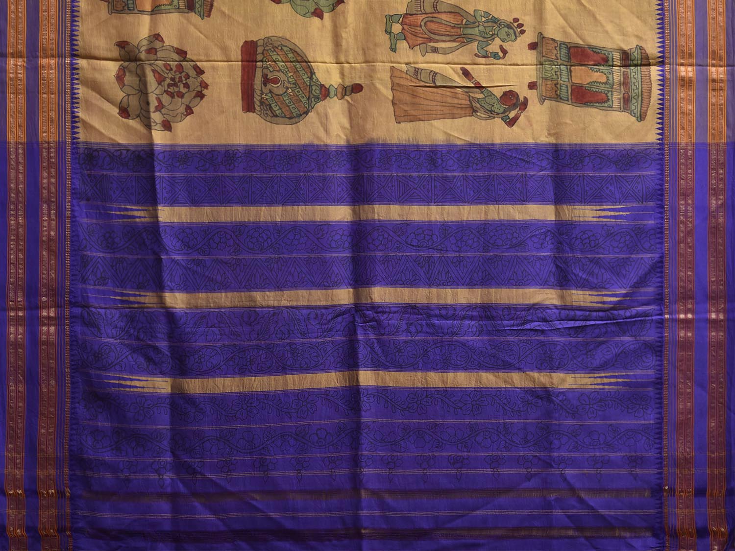 Light Yellow and Dark Blue Kalamkari Hand Painted Narayanpet Pure Silk Saree with All Over Design No Blouse. This hand painted kalamkari is done using natural dyes. As they are natural colors they bleed with initial washes, so we suggest Dry clean. This Saree has No Blouse.