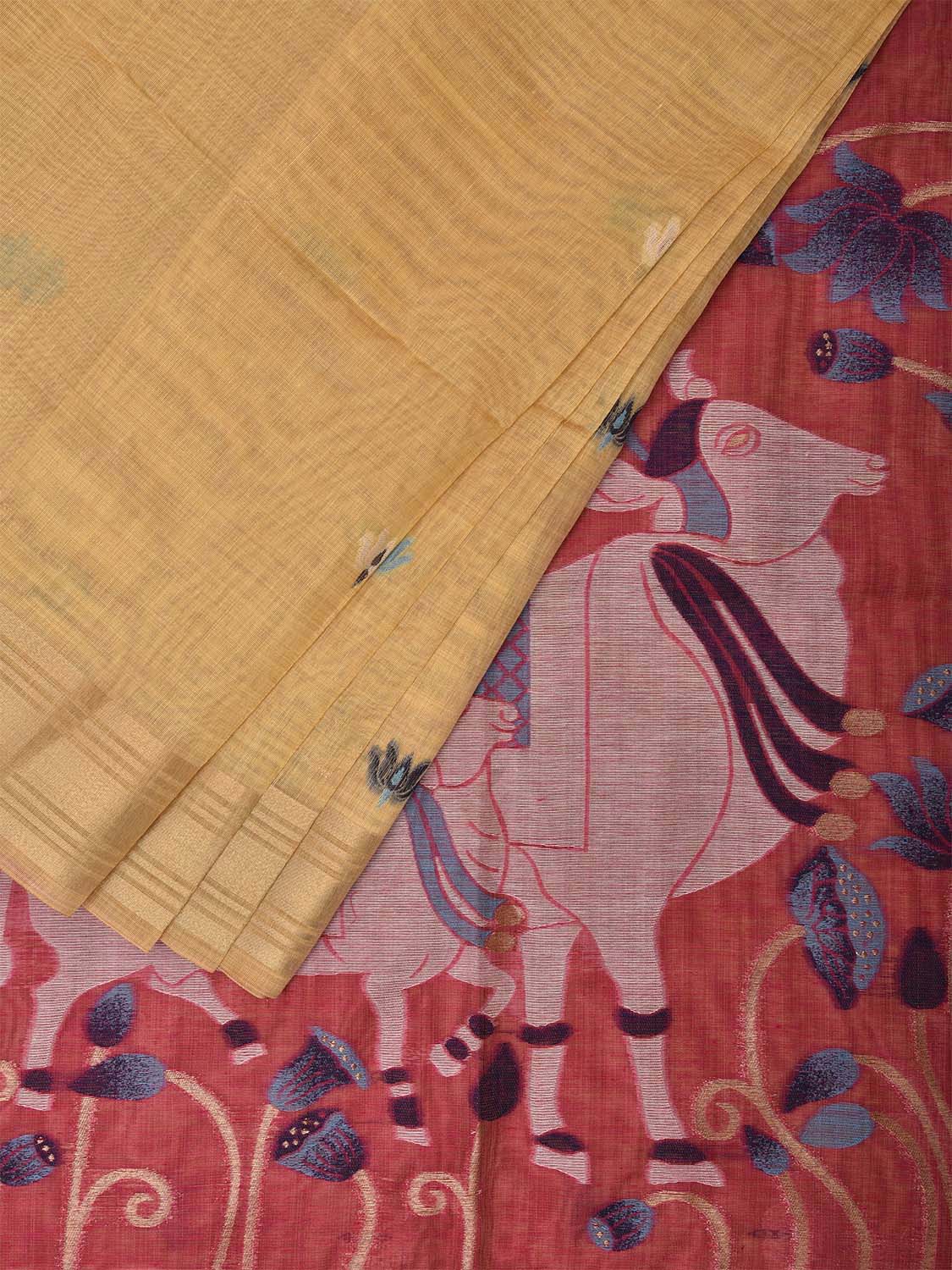 Light Yellow and Red Dhakai Jamdani Cotton Viscose Saree with Floral and Cows Pallu Design dj0025