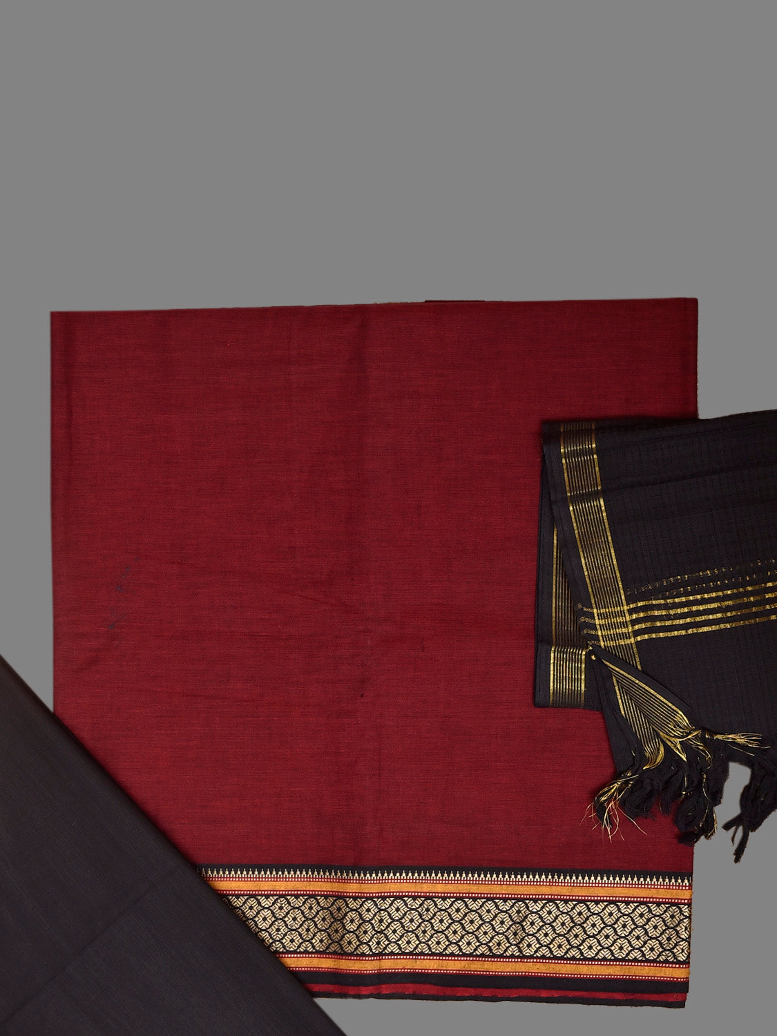 Maroon and Black Kanchipuram Cotton Dress Material with Plain Top Dupatta and Bottom Design dm0085