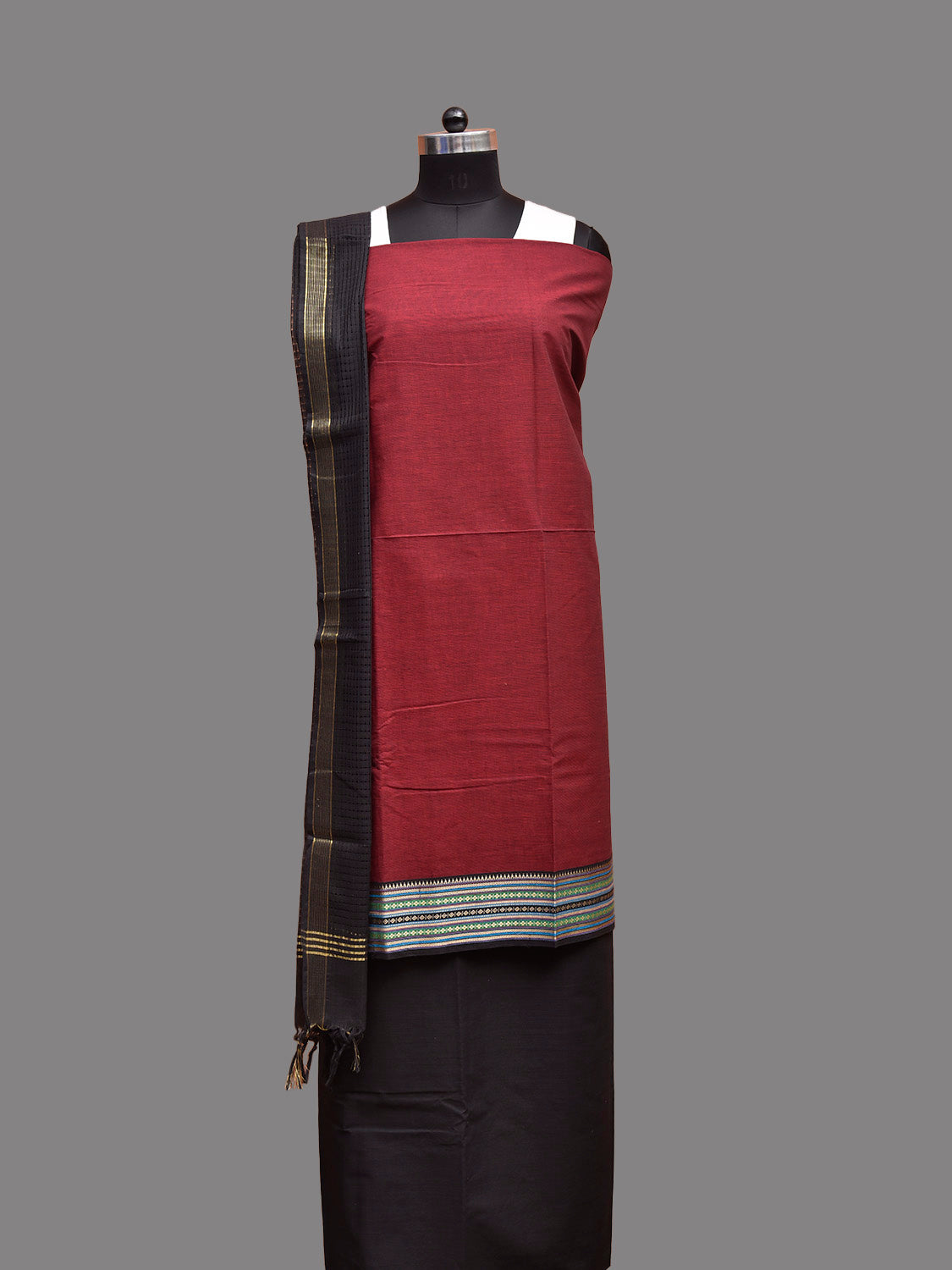 Maroon and Black Kanchipuram Cotton Dress Material with Top Bottom and Dupatta 2.5mt Length. We Advise Gentle Handwash for Fabric Care.