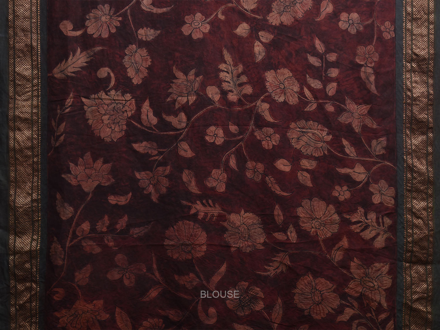 Maroon and Grey Kalamkari Hand Painted Paithani Silk Saree with Lotus Pallu and Floral Design KL0826