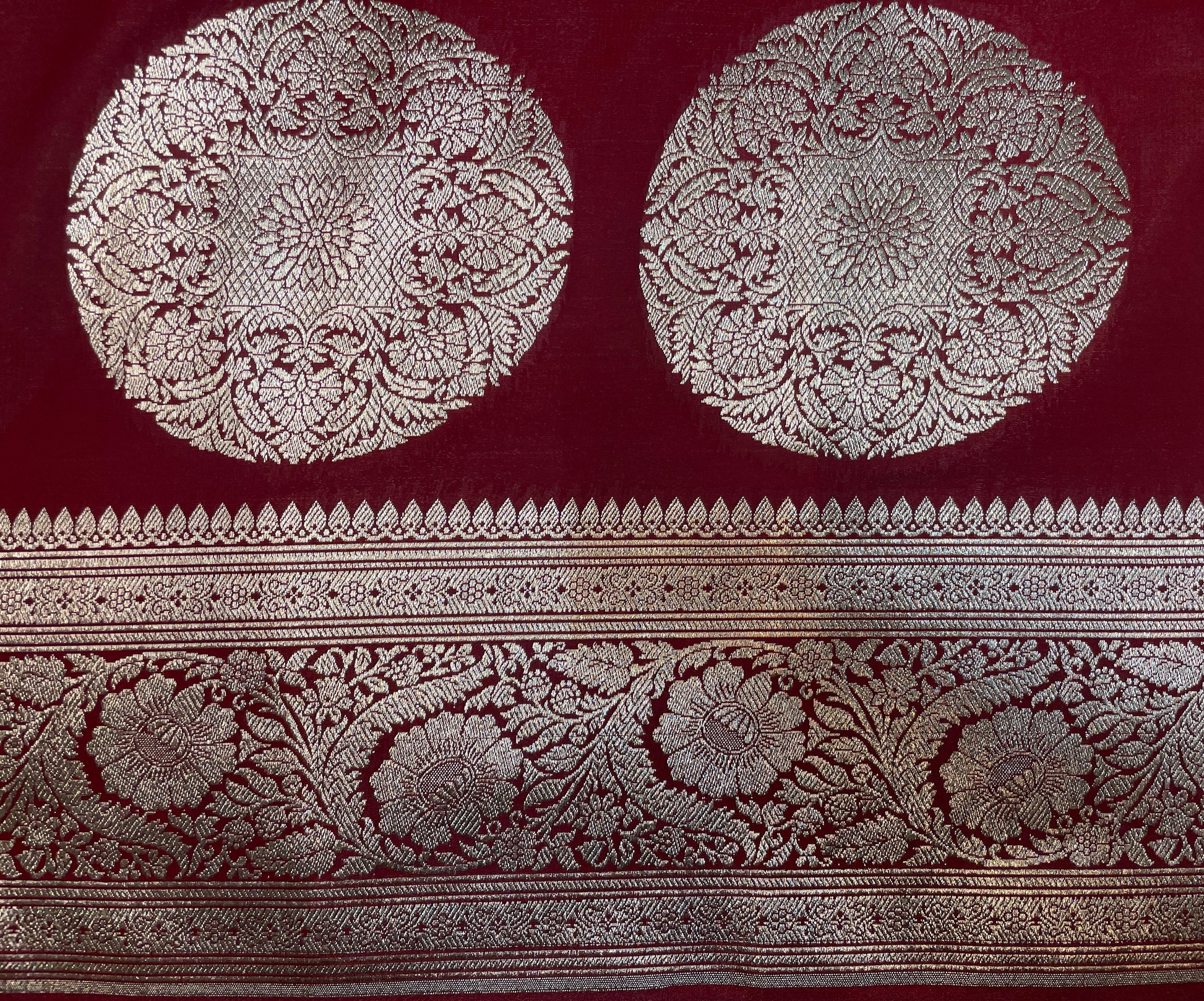 Maroon Katan Banarasi Saree with Silver Zari Floral Weaving And Grand Pallu B0591ds
