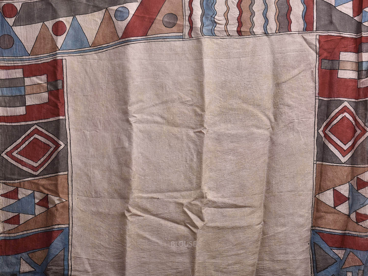 Multicolor Kalamkari Hand Painted Sico Saree with All Over Geometric Design. This hand painted kalamkari is done using natural dyes. As they are natural colors they bleed with initial washes, so we suggest Dry clean.