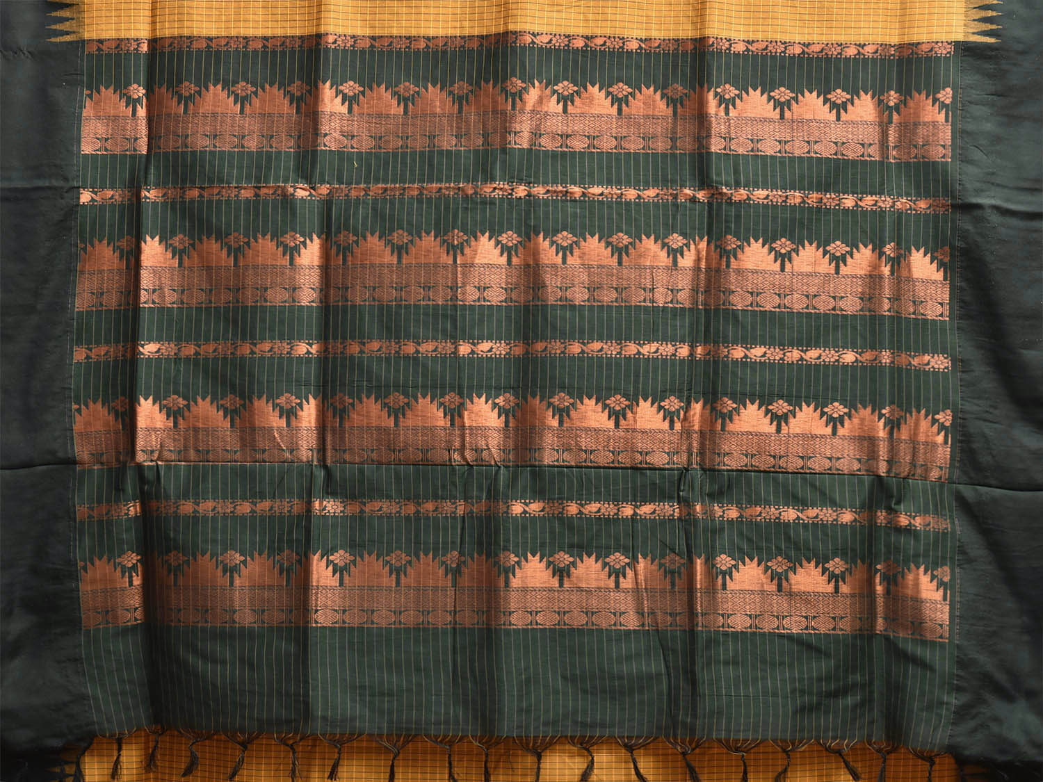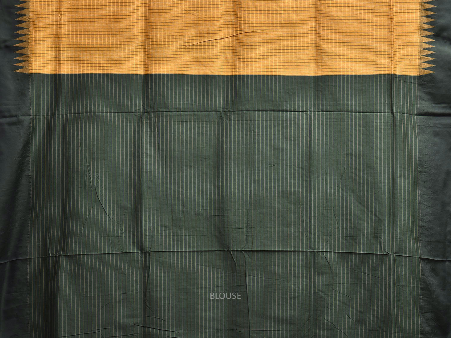 Mustard and Green Gadwal Cotton Viscose Saree with Checks and Pallu Design. Gadwal Sarees are known for their tradtional design of border and pallu made of silk and body being either cotton or silk. They are known as Sico sarees for border and pallu being silk and body being cotton. We advice gentle handwash separately for fabric care.