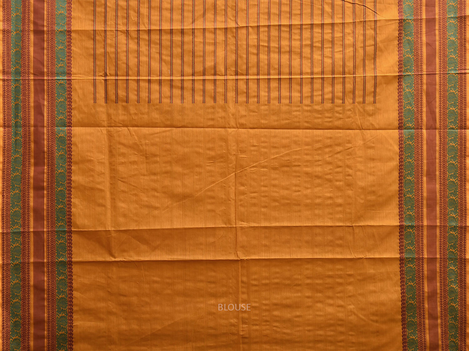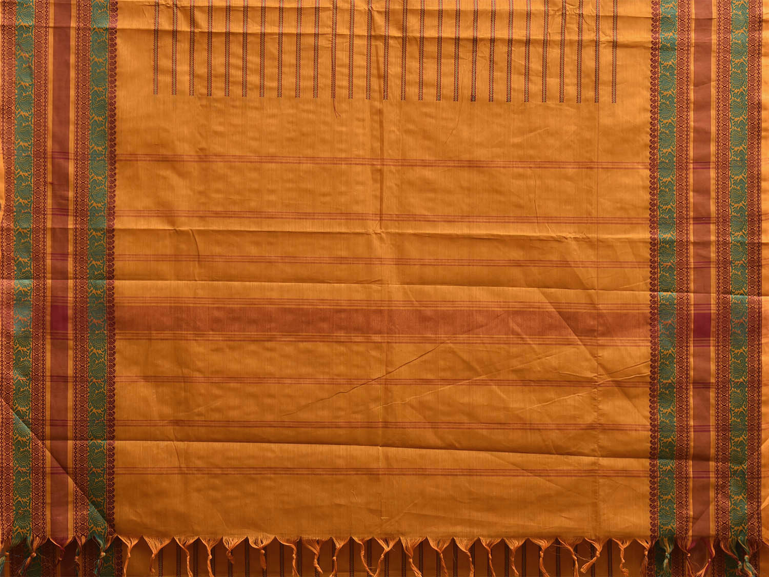 Mustard Kanchipuram Cotton Saree with Strips Body and Border Design. Traditional Simple South Indian Attire Saree for any Casual Occasions. As it’s a cotton saree we advice gentle handwash separately for fabric care.