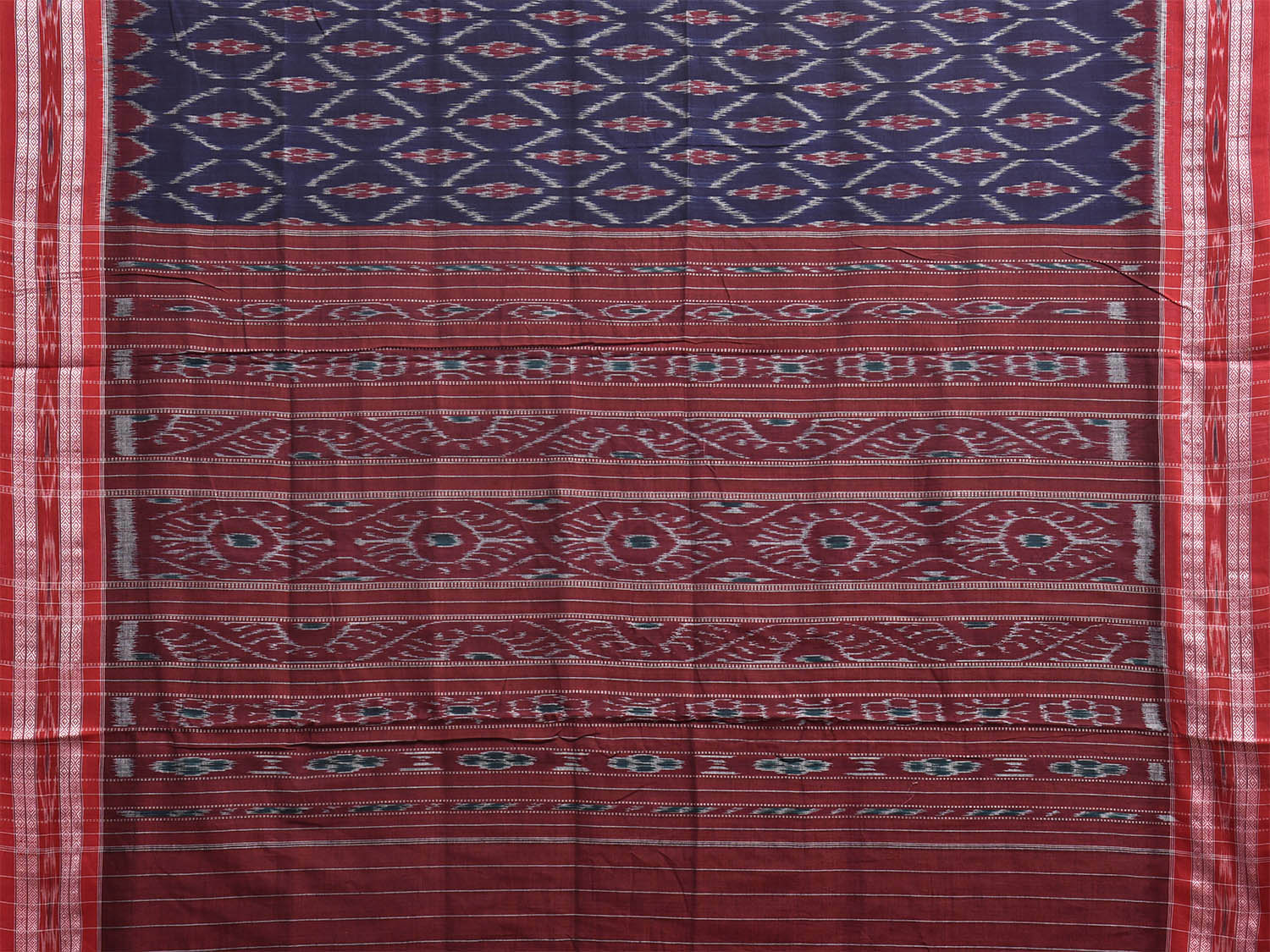 Navy and Maroon Ikat Cotton Saree with Grill Body and Pallu Design No Blouse. This Handloom Saree from Andhra Pradesh has been woven using the resist-dyeing, which produces the unique patterns adorning the fabric. We advise gentle handwash separately for fabric care. This saree has no blouse.