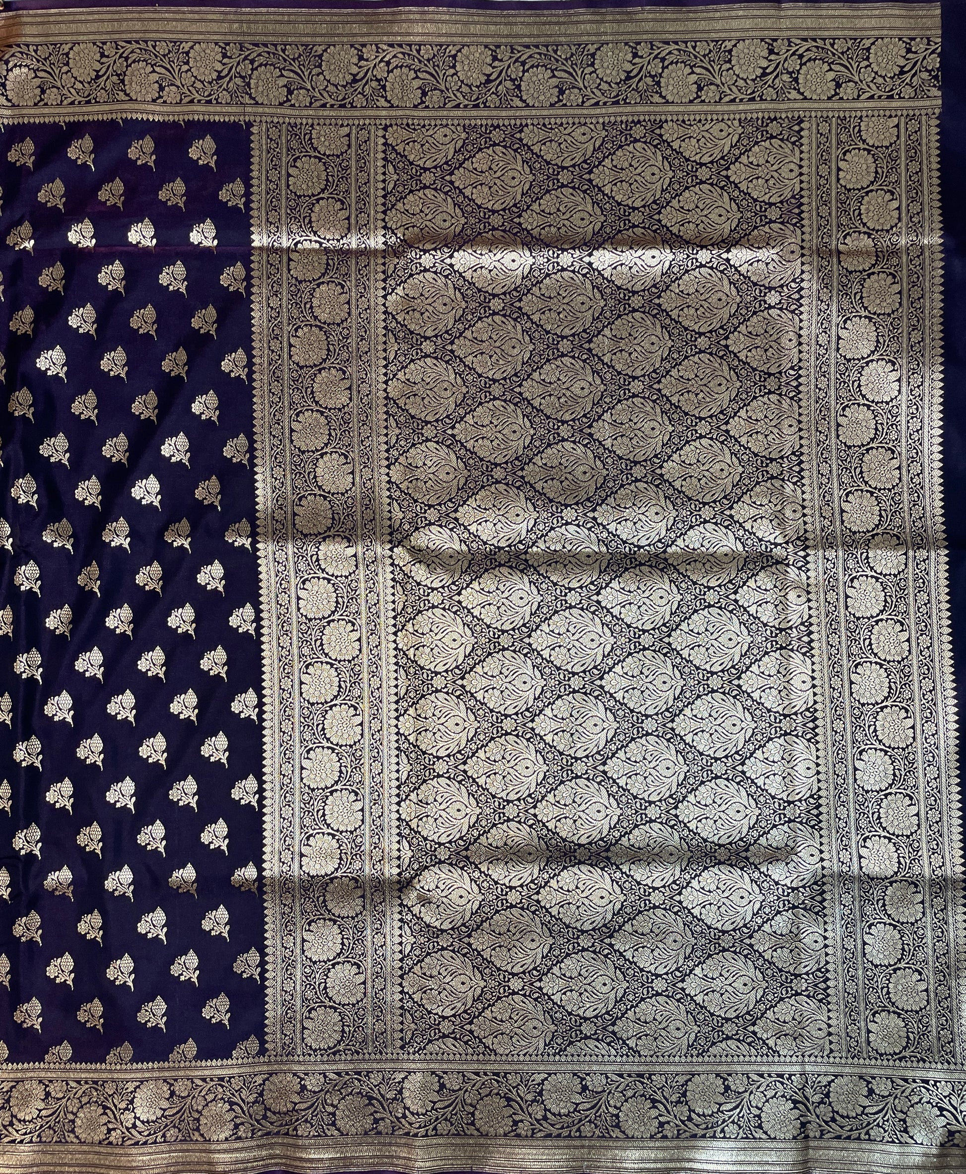 Navy Blue Katan Banarasi Saree with Gold Zari Floral Weaving And Grand Pallu B0664ds