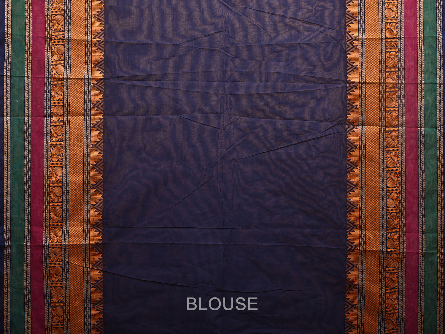 Navy Kanchipuram Cotton Saree with Strips Pallu and Temple Border Design. Traditional Simple South Indian Attire Saree for any Special Occasions. As it’s a cotton saree we advice gentle handwash separately for fabric care.