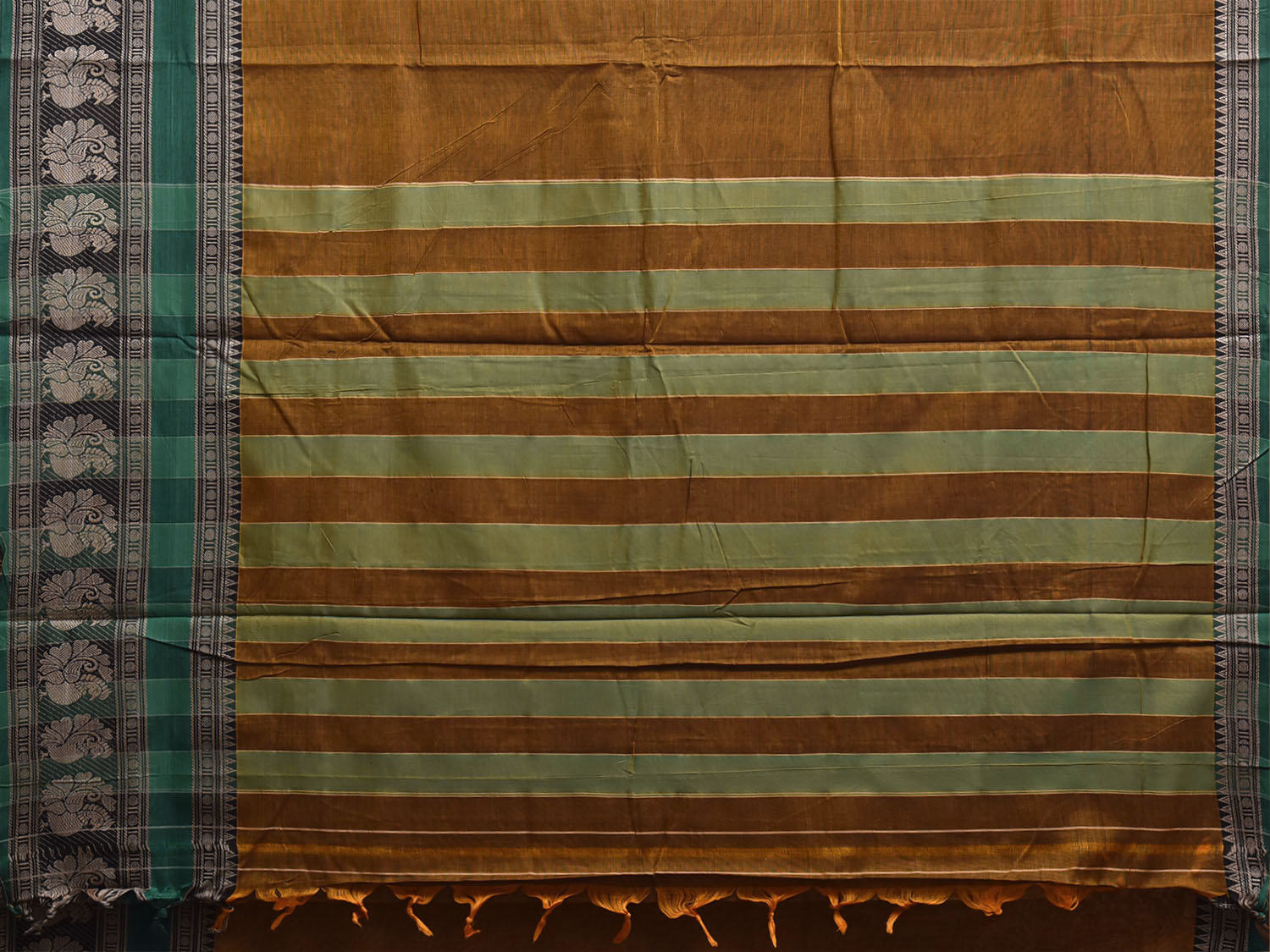 Olive and Green Narayanpet Cotton Plain Saree with Strips Pallu and Border Design No Blouse. This saree has no blouse.