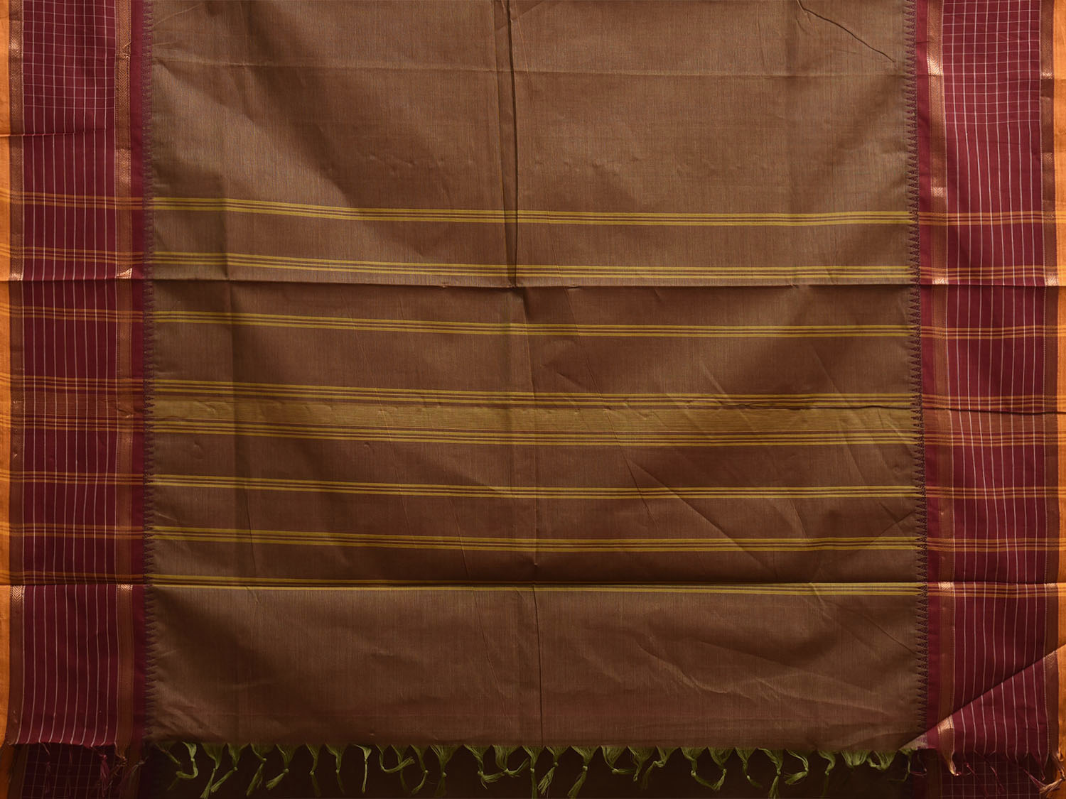 Olive and Maroon Kanchipuram Cotton Plain Saree with Checks Border Design k0917
