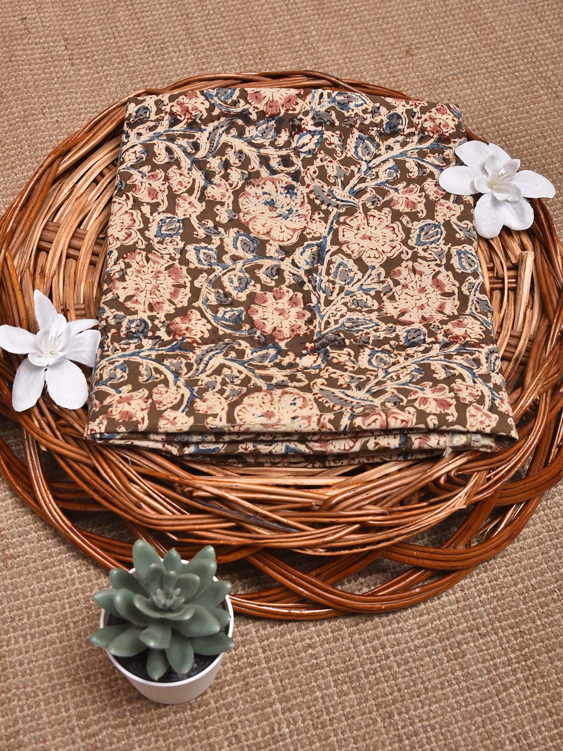 Olive and Red Kalamkari Block Print Cotton Blouse with Floral Design 1.2mt Length 35 Inches Width. Beautiful Pattern Blouse Fabric and Easy to Match to Any Suitable Saree. For fabric care we advise gentle handwash separately as they may bleed in the initial wash.