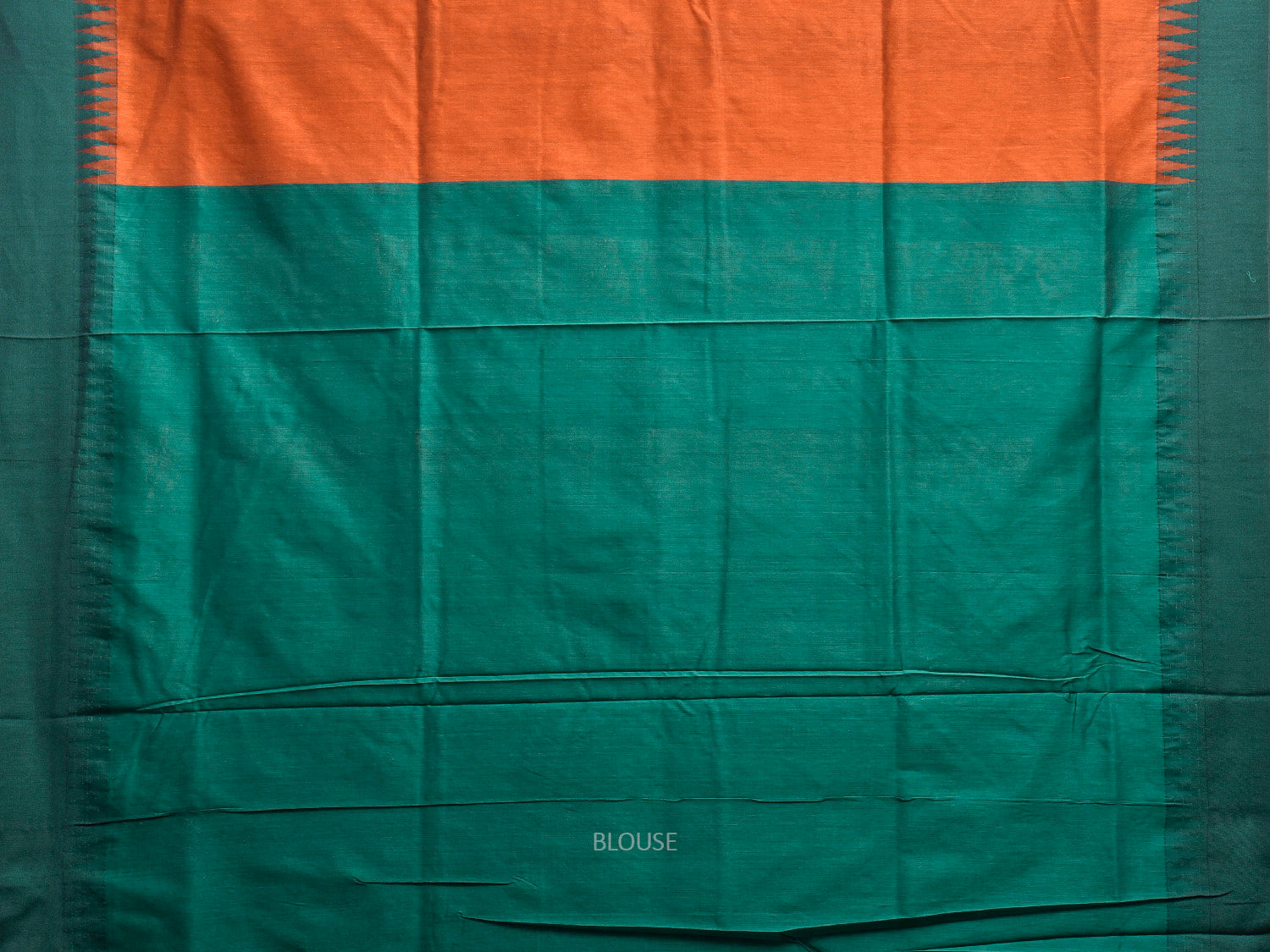 Orange and Green Gadwal Cotton Viscose Saree with Temple Border Design. Gadwal Sarees are known for their traditional design of border and pallu made of silk and body being either cotton or silk. They are known as Sico sarees for border and pallu being silk and body being cotton. We advice dry clean for fabric care.