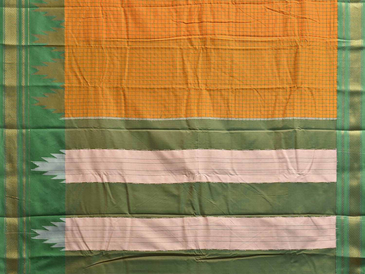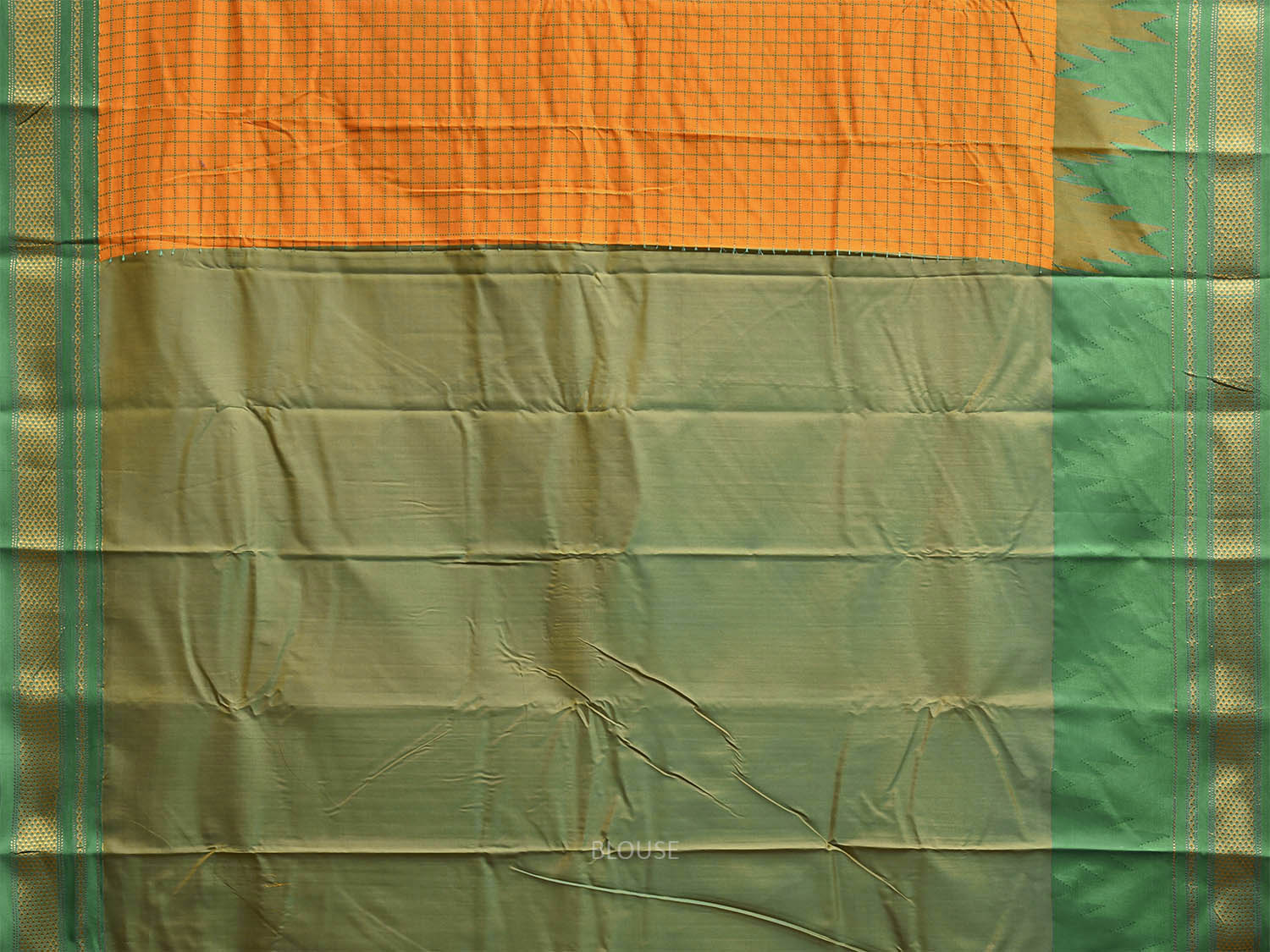 Orange and Green ilkal Cotton Viscose Saree with Checks and Temple Border Design. For fabric care we advise gentle handwash separately.