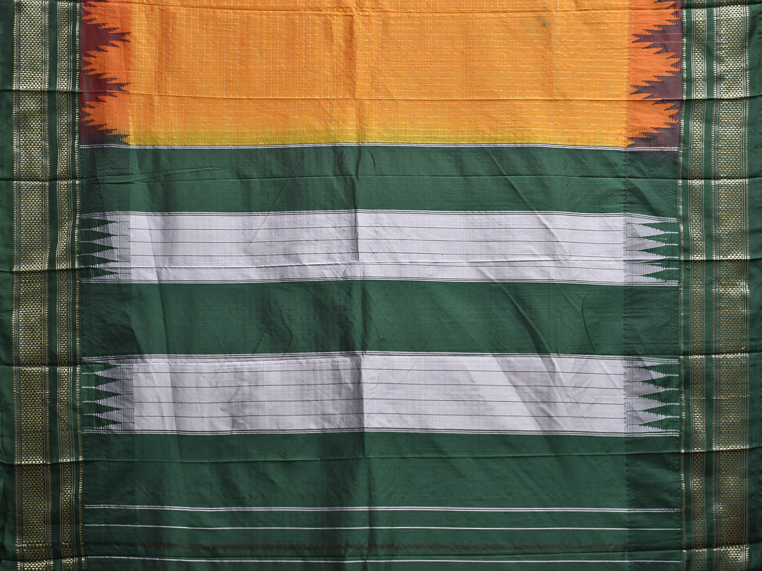 Orange and Green ilkal Viscose Saree with Checks and Big Temple Border Design. For fabric care we advise gentle handwash separately.