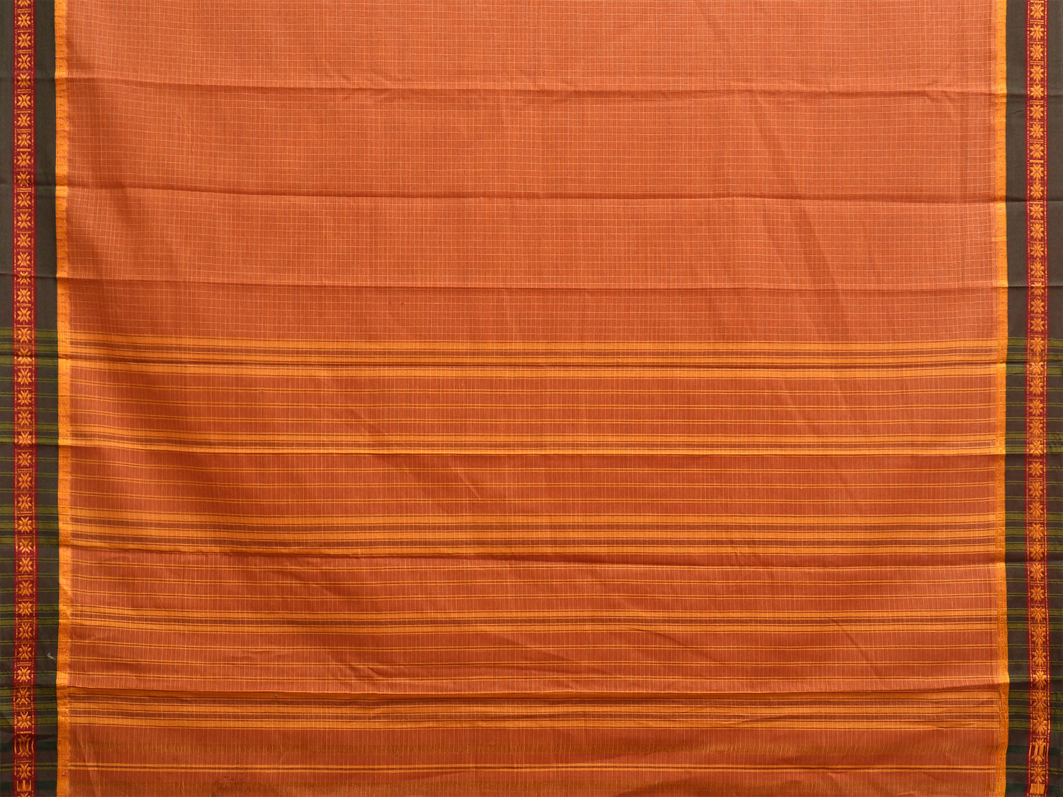 Orange and Green Narayanpet Cotton Handloom Saree with Checks Design No Blouse. This saree has no blouse.