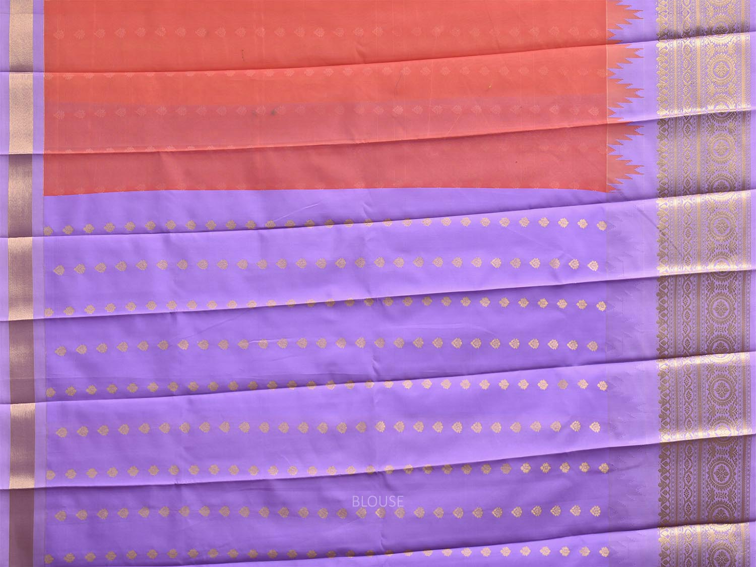 Orange and Lavender Gadwal Cotton Viscose Saree with Temple Border and Pallu Design. Gadwal Sarees are known for their tradtional design of border and pallu made of silk and body being either cotton or silk. They are known as Sico sarees for border and pallu being silk and body being cotton. We advice dry clean for fabric care.