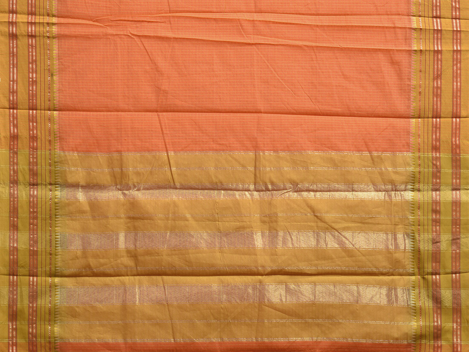 Orange and Olive Bamboo Cotton Viscose Silk Saree with Checks Design No Blouse. This is a blend of bamboo and cotton fibers, they have characteristics of both bamboo and cotton combined into one fabric. We Advise Gentle Handwash for Fabric Care. This Saree has no Blouse.