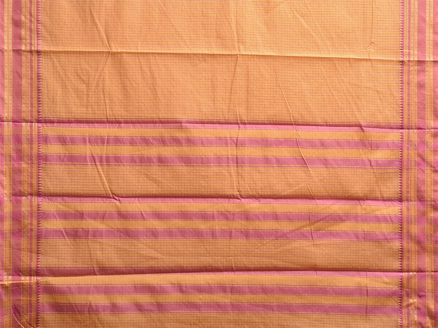 Orange and Pink Bamboo Cotton Saree with Checks Design No Blouse. This is a blend of bamboo and cotton fibers, they have characteristics of both bamboo and cotton combined into one fabric. We Advise Gentle Handwash for Fabric Care. This Saree has no Blouse.