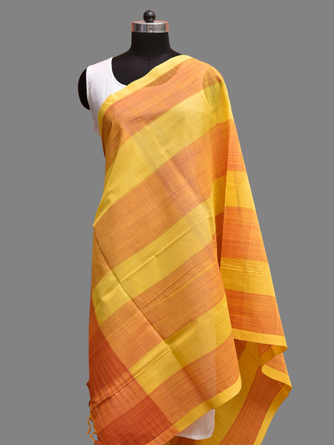 Orange and Yellow Mangalgiri Cotton Handloom Dupatta with Strips Design. We Advise Gentle Handwash for Fabric Care.