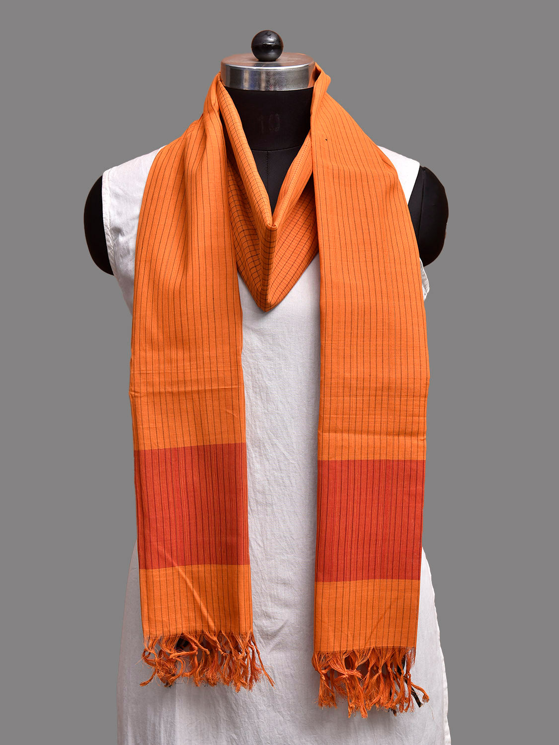 Orange Mangalgiri Cotton Handloom Dupatta with Checks and Strips Design. We Advise Gentle Handwash for Fabric Care.
