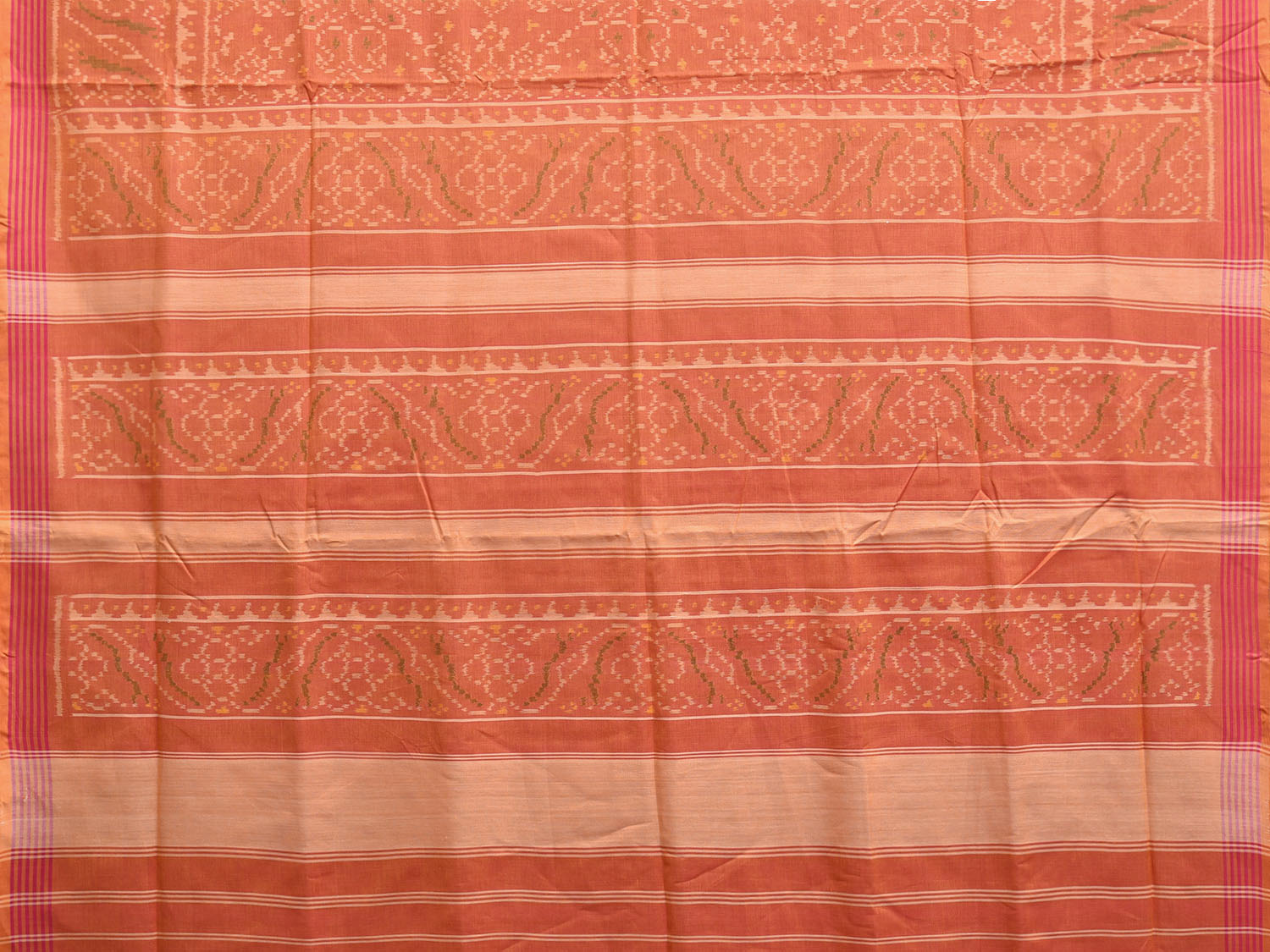 Orange Pochampally Ikat Cotton Handloom Saree with All Over and Border Design. This Handloom Saree from Andhra Pradesh has been woven using the resist-dyeing, which produces the unique patterns adorning the fabric. We advise Gentle Handwash Separately for fabric care.