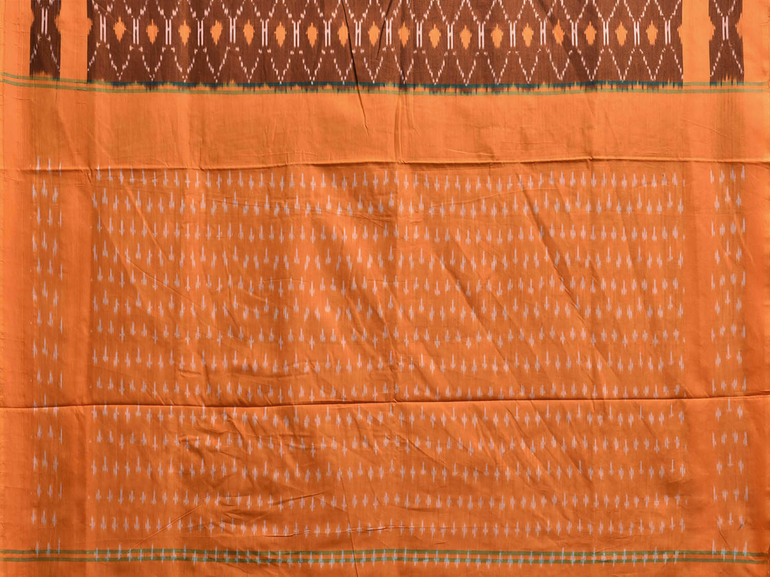 Orange Pochampally Ikat Cotton Handloom Saree with Grill Design No Blouse. This Handloom Saree from Andhra Pradesh has been woven using the resist-dyeing, which produces the unique patterns adorning the fabric. We advise gentle handwash separately for fabric care. This saree has no blouse.