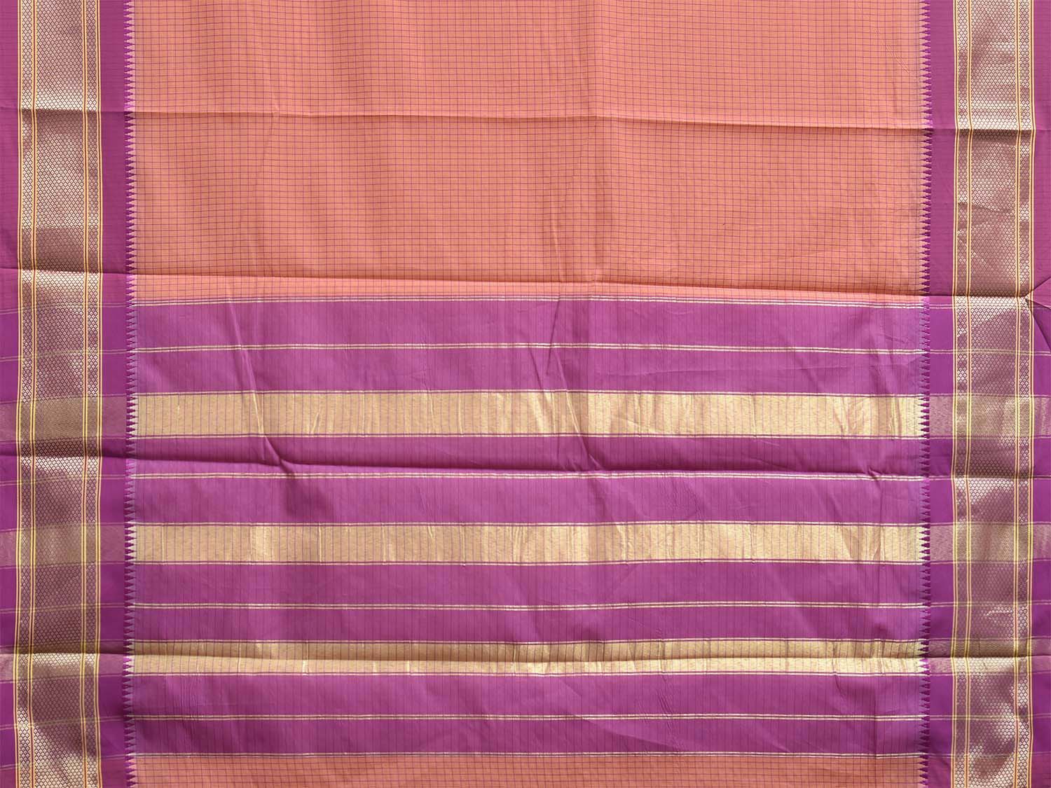 Peach and Pink Bamboo Cotton Saree with Checks Design No Blouse. This is a blend of bamboo and cotton fibers, they have characteristics of both bamboo and cotton combined into one fabric. We Advise Gentle Handwash for Fabric Care. This saree has no blouse.
