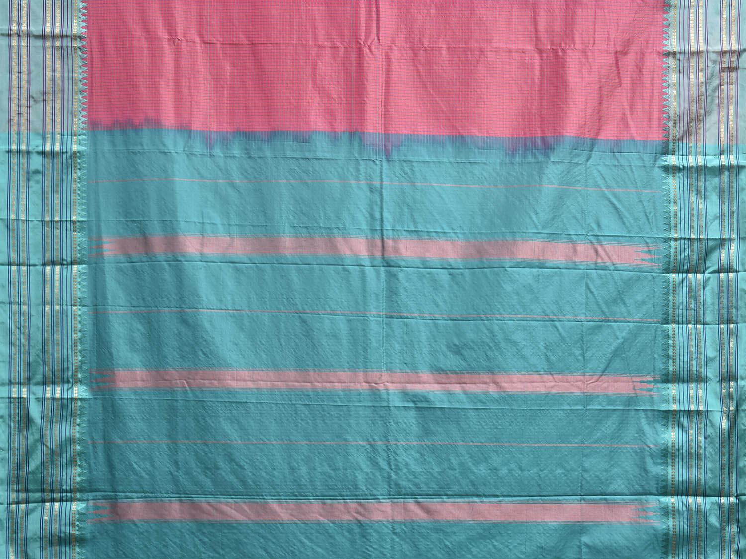 Peach and Turquoise Narayanpet Silk Saree with Checks and Contrast Pallu Design np1409