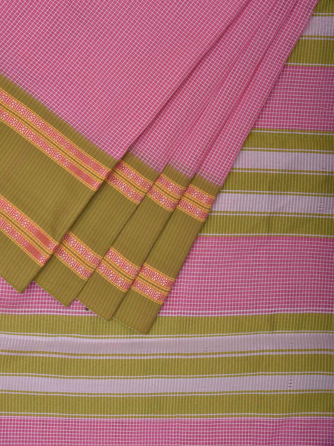 Pink and Green Bamboo Cotton Saree with Small Checks Design No Blouse bc0701