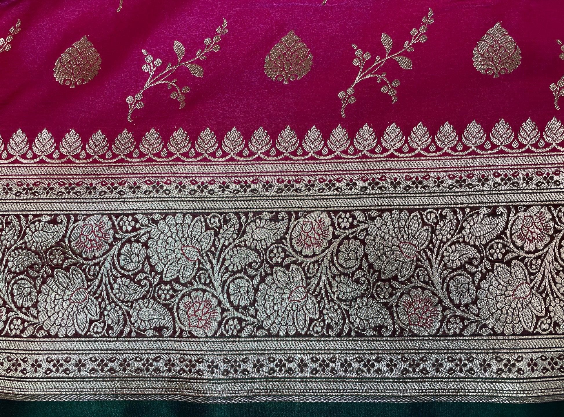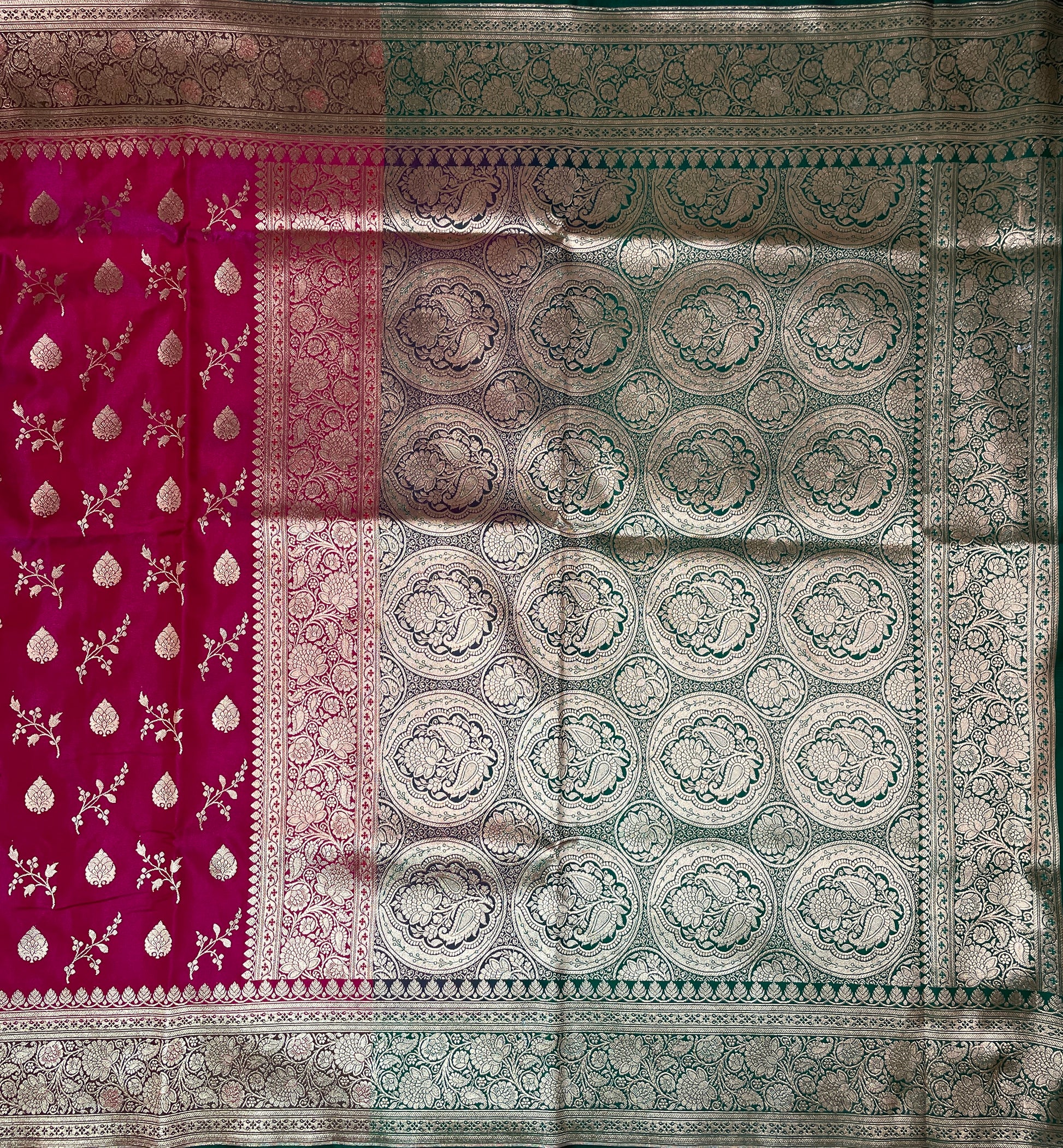 Pink And Green Katan Banarasi Saree with Silver Zari Floral Weaving And Grand Pallu B0532ds