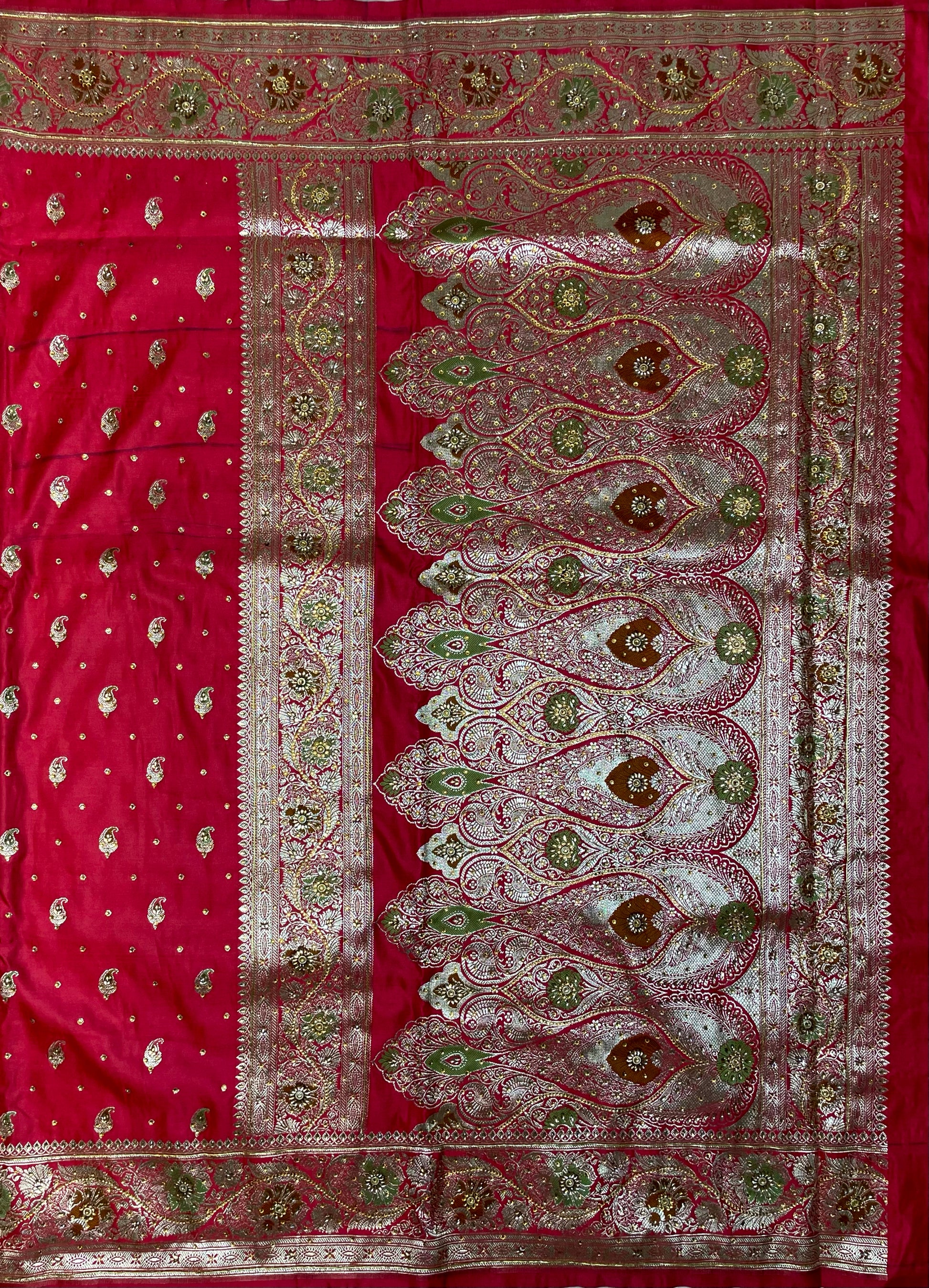 Drape yourself in timeless elegance with this exquisite emerald green Banarasi silk saree, adorned with delicate silver zari motifs throughout the body. The saree features an intricately woven floral and paisley border, complemented by a regal pallu with detailed brocade craftsmanship that reflects the rich heritage of Banaras.Perfect for weddings, festive occasions, and grand celebrations, this saree brings together tradition and luxury in every drape. The lustrous silk fabric adds a graceful fall and sheen, while the silver zari creates a stunning contrast that enhances its royal charm.