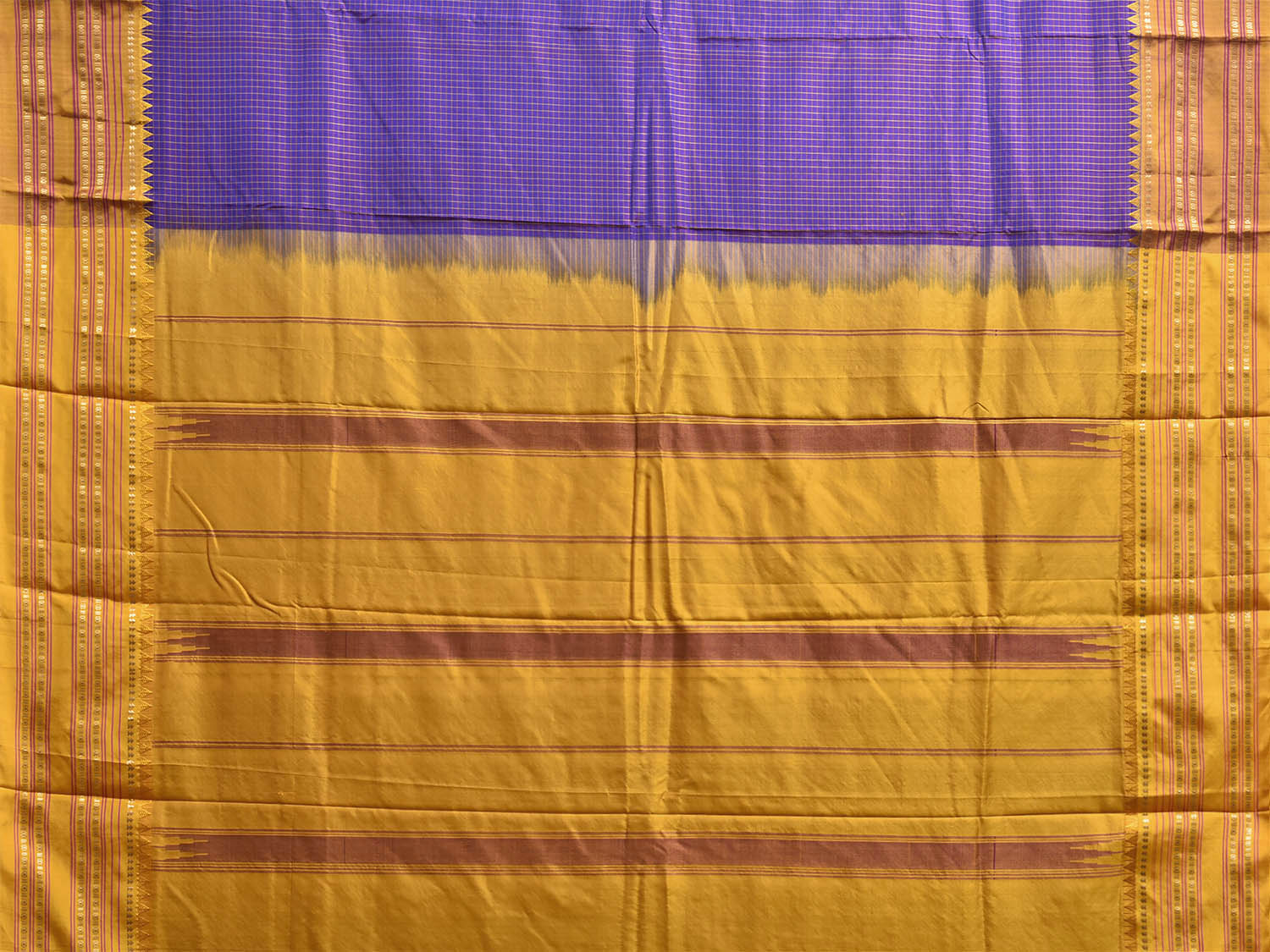 Purple and Yellow Narayanpet Silk Saree with Check Design. Saree length is 6.2mts.