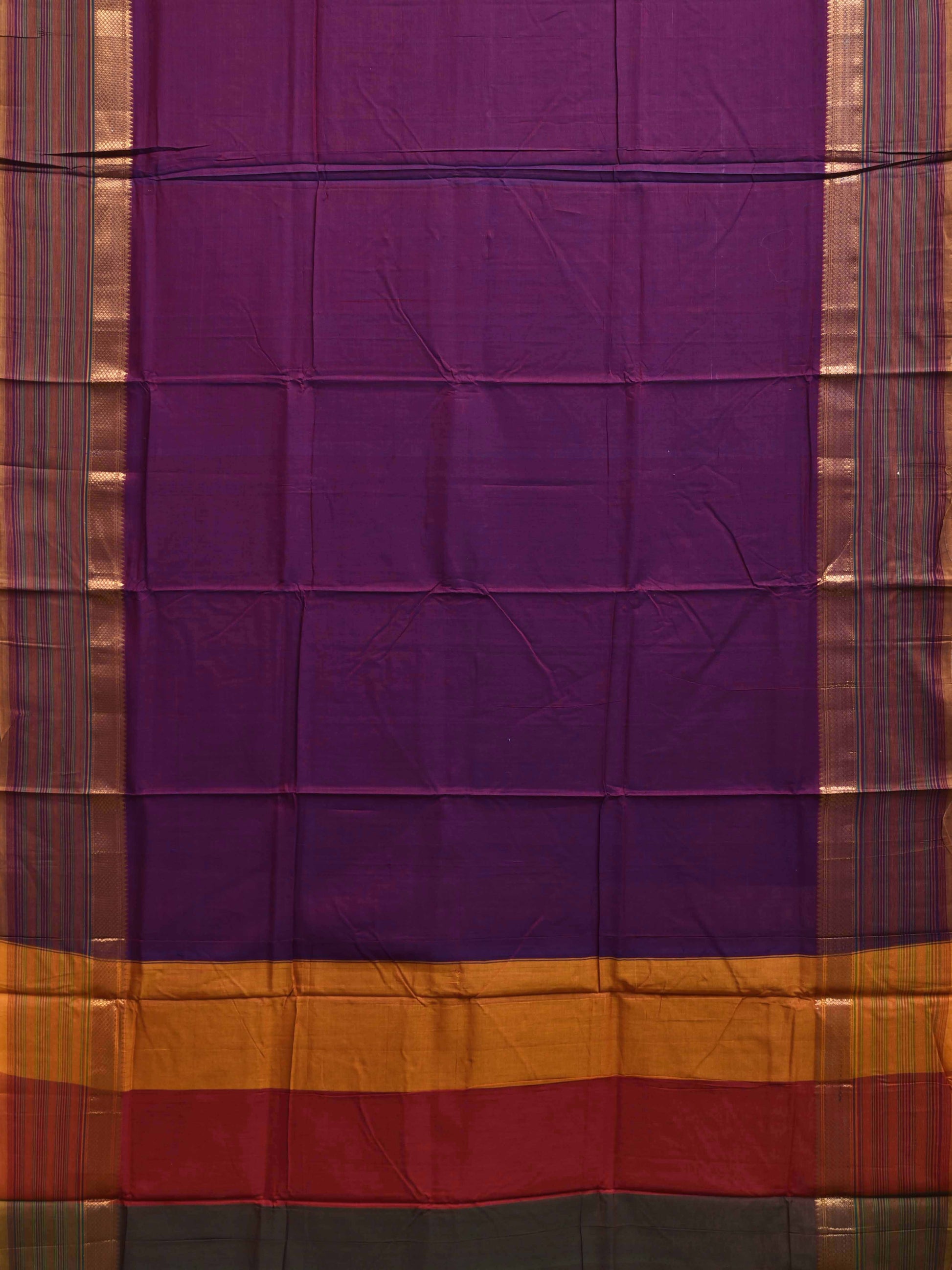 Purple Kanchipuram Cotton Plain Saree with Strips Pallu and Border Design No Blouse. Traditional Simple South Indian Attire Saree for any Casual Occasions. As it’s a cotton saree we advice gentle handwash separately for fabric care. This saree has no blouse.