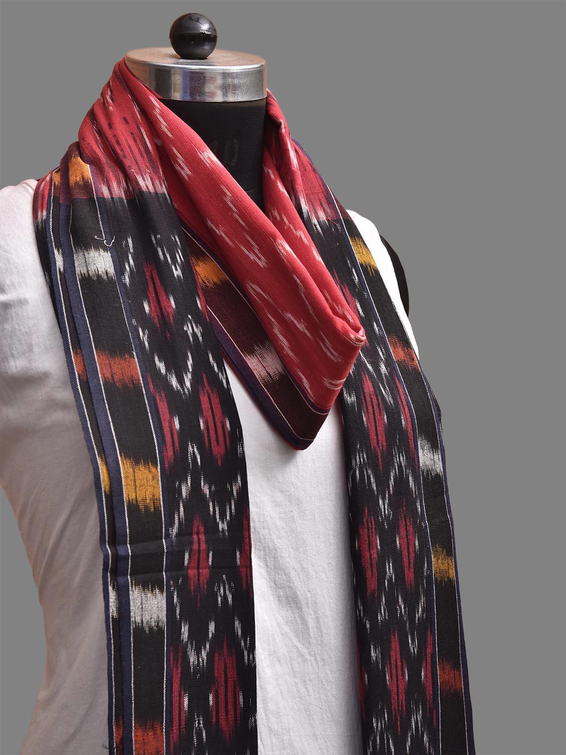 Red and Black Pochampally Ikat Cotton Handloom Dupatta with Zig-Zag Design. This Handloom Saree has been woven using the resist-dyeing, which produces the unique patterns adorning the fabric. We advise gentle handwash separately for fabric care.