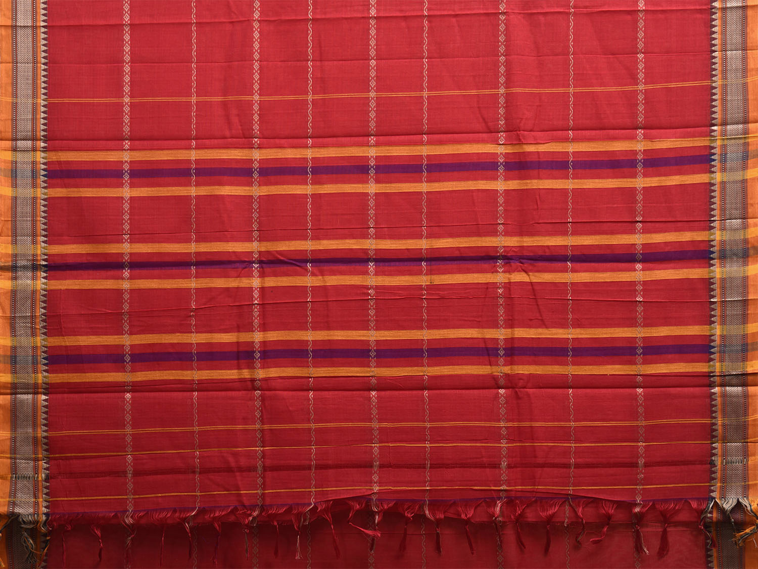 Red and Yellow Kanchipuram Cotton Saree with Strips and Small Border Design No Blouse k0895