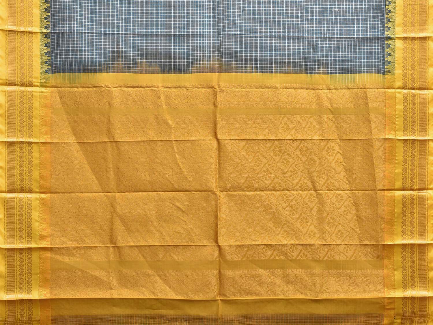 Teal and Yellow Gadwal Cotton Body Viscose Border Saree with Checks Design No Blouse. Gadwal Sarees are known for their traditional design of border and pallu made of silk and body being either cotton or silk. They are known as Sico sarees for border and pallu being silk and body being cotton. We advice dry clean for fabric care. This saree has no blouse.