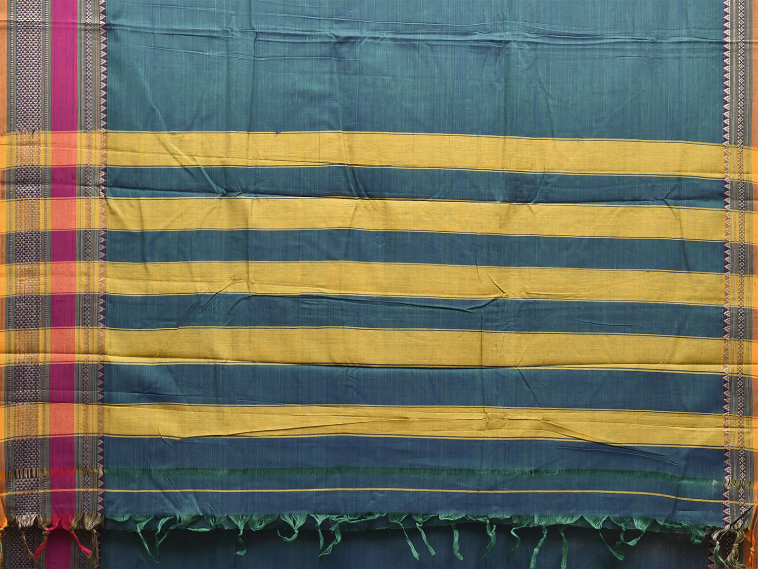 Teal and Yellow Narayanpet Cotton Plain Saree with Strips Pallu and Border Design No Blouse. This saree has no blouse.