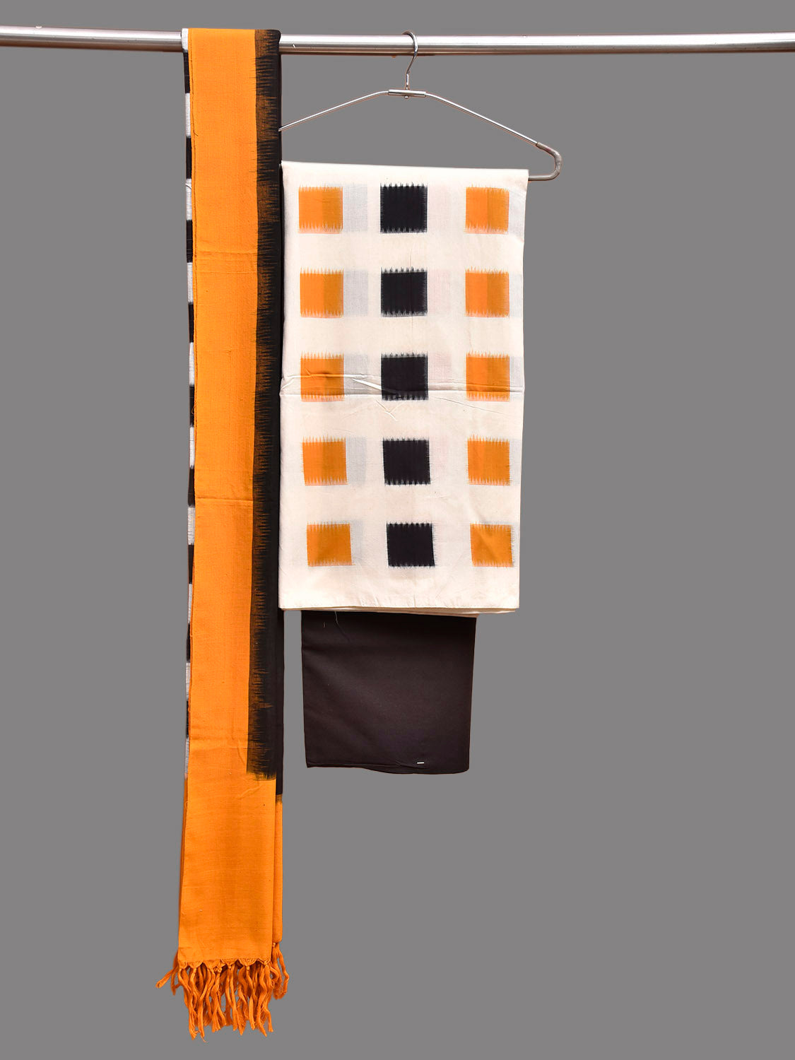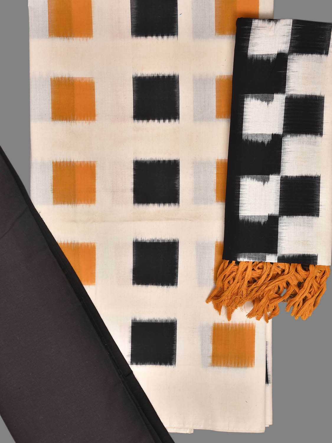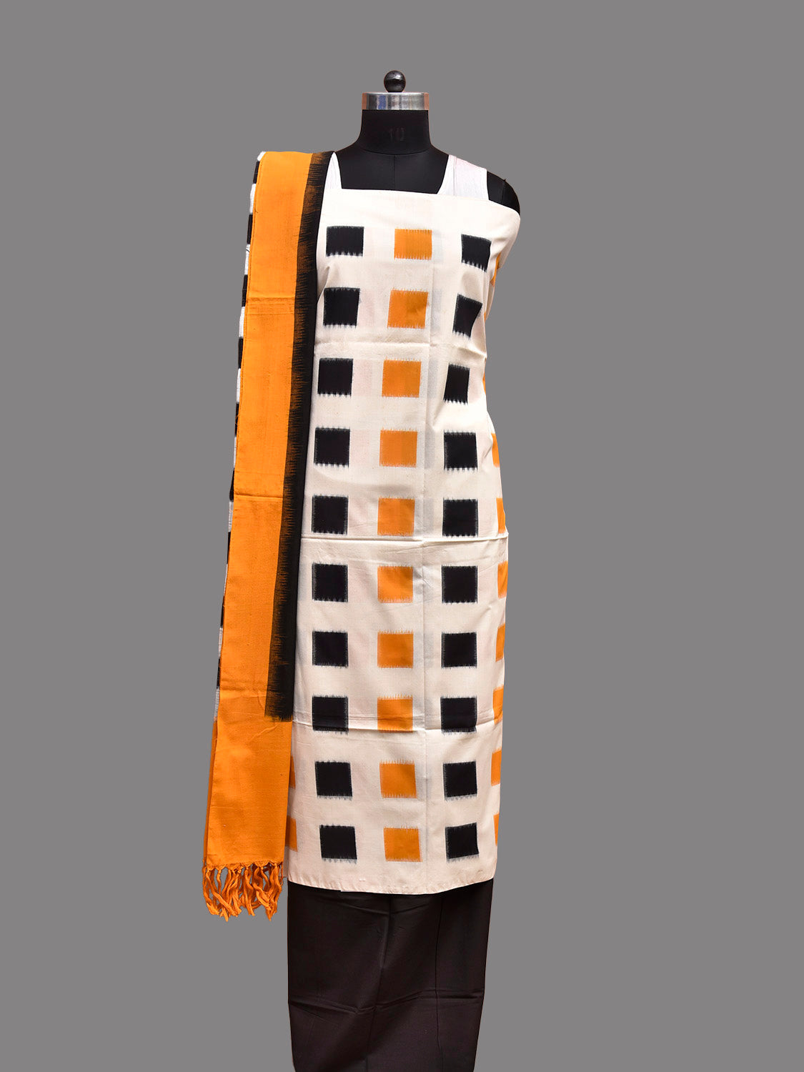 White and Yellow Pochampally Ikat Cotton Handloom Dress Material with Top Bottom and Dupatta 2.5mt Length dm0091