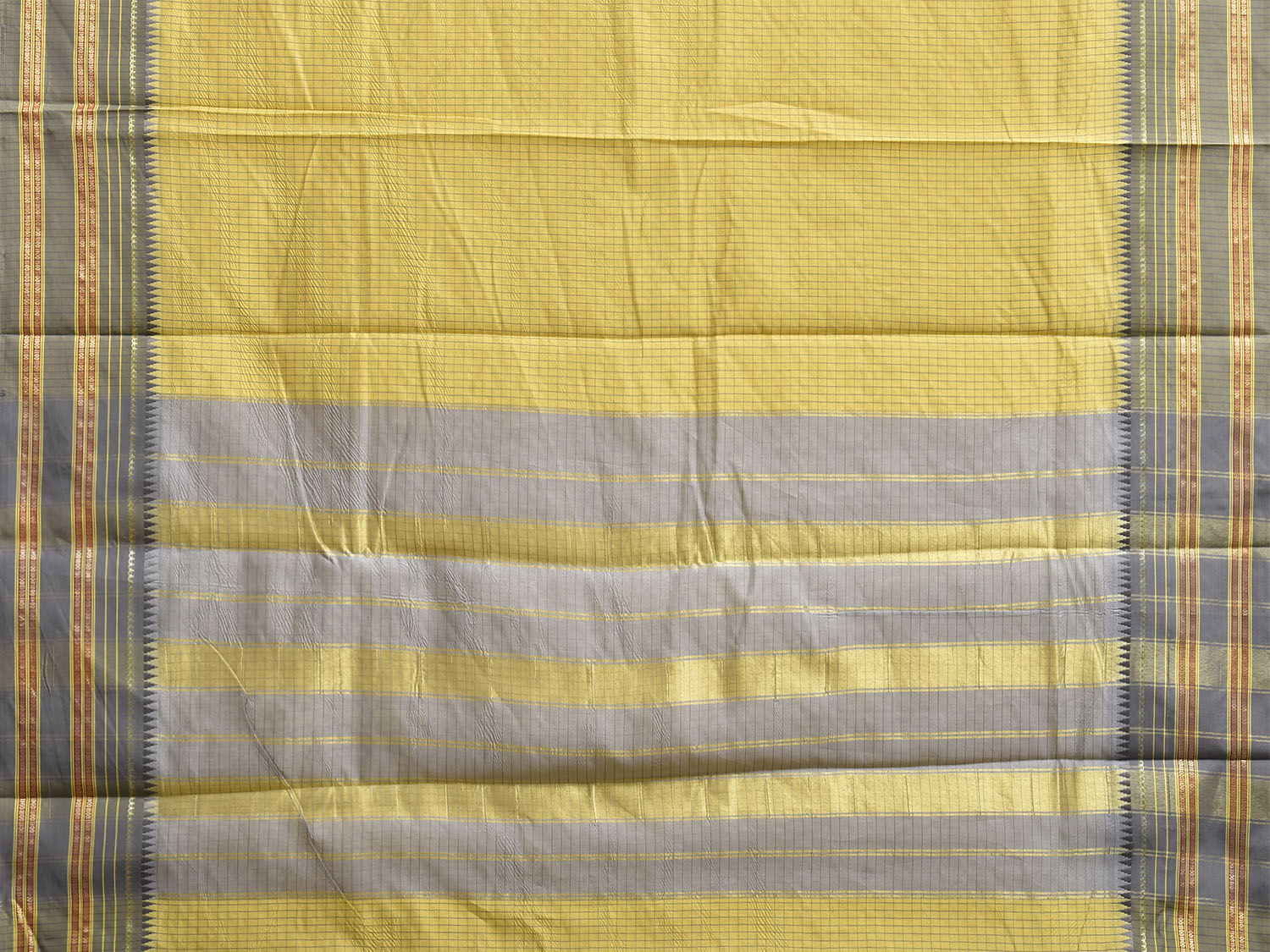 Yellow and Grey Bamboo Cotton Viscose Silk Saree with Checks Design No Blouse. This is a blend of bamboo and cotton fibers, they have characteristics of both bamboo and cotton combined into one fabric. We Advise Gentle Handwash for Fabric Care. This saree has no blouse.