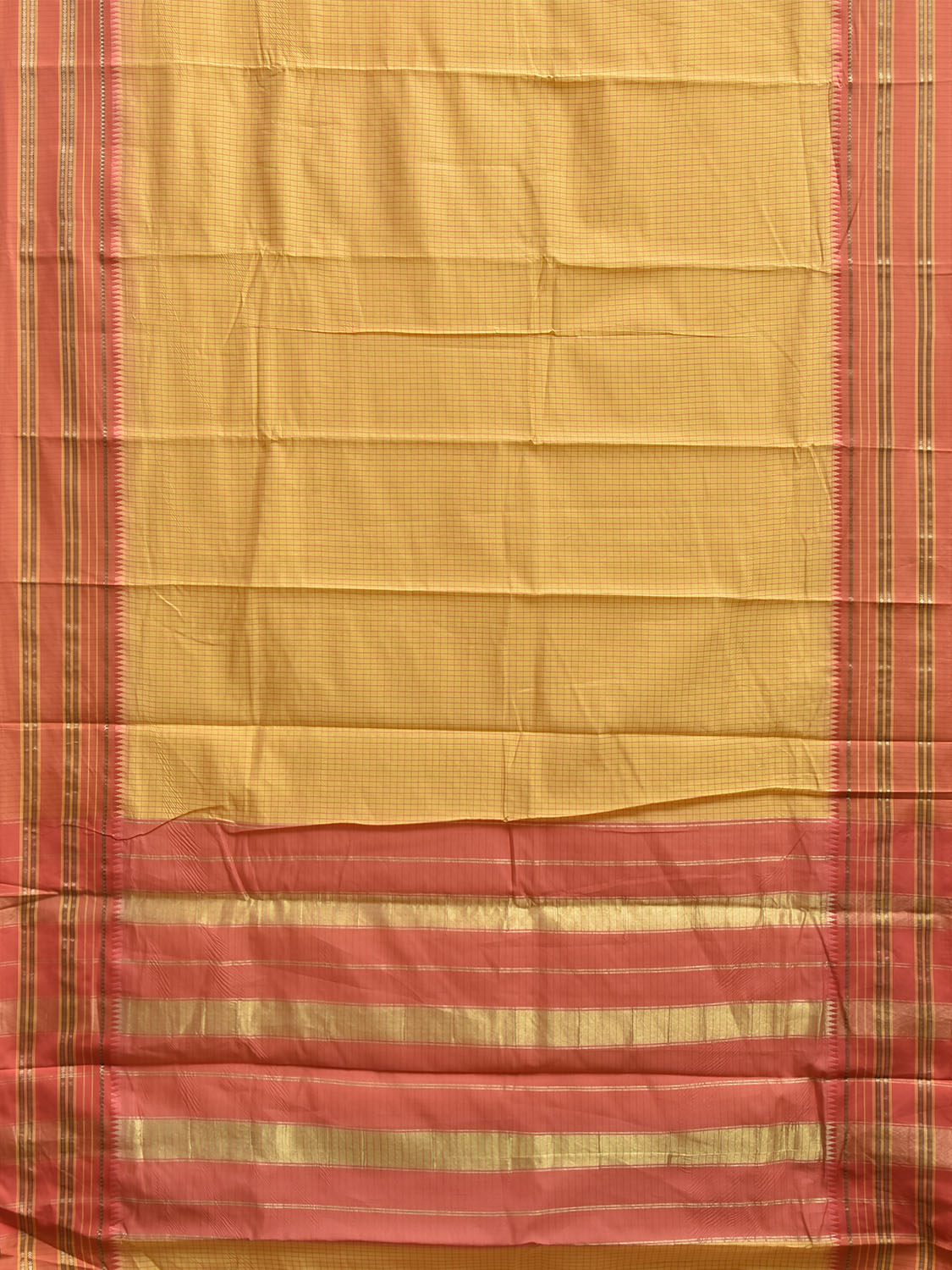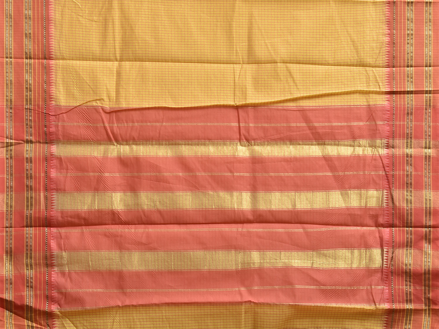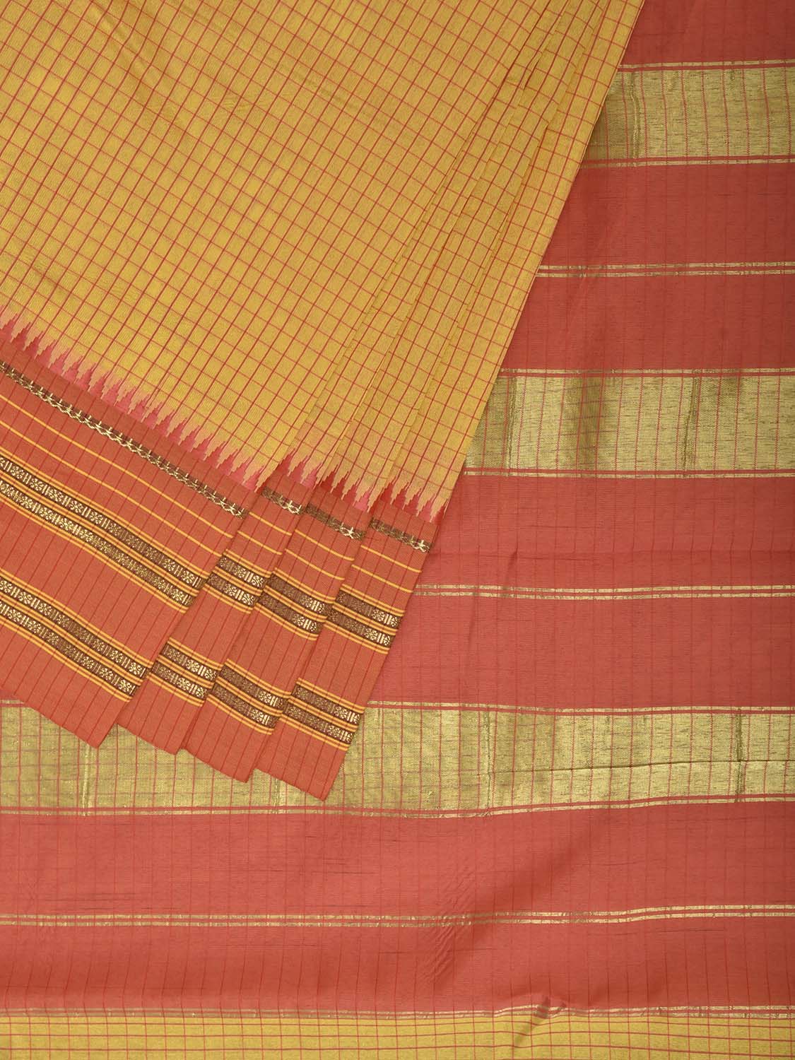 Yellow and Peach Bamboo Cotton Viscose Silk Saree with Checks Design No Blouse bc1021