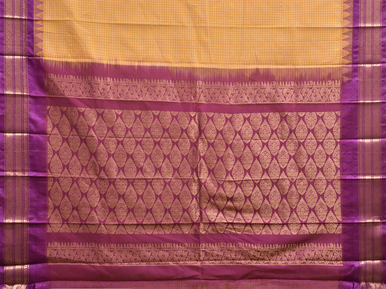 Yellow and Purple Gadwal Cotton Body Viscose Border Saree with Checks Design No Blouse. Gadwal Sarees are known for their traditional design of border and pallu made of silk and body being either cotton or silk. They are known as Sico sarees for border and pallu being silk and body being cotton. We advice dry clean for fabric care. This saree has no blouse.