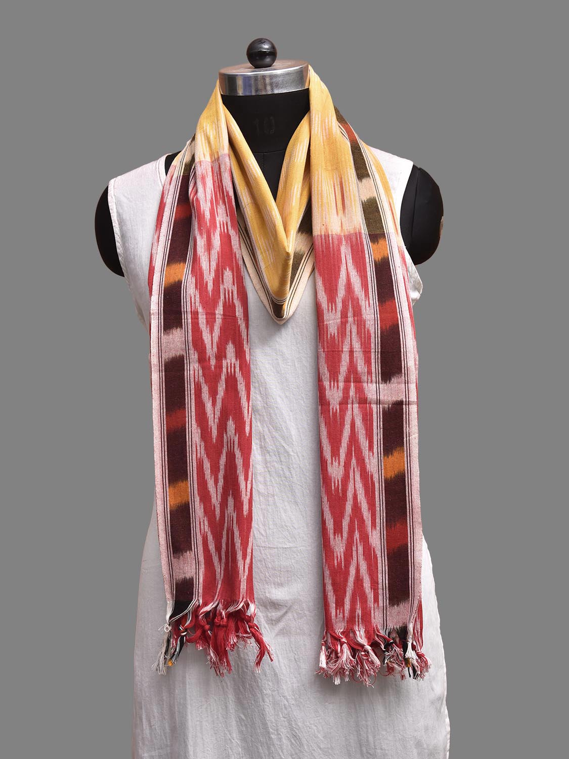 Yellow and Red Pochampally Ikat Cotton Handloom Dupatta with Strips and Zig-Zag Design ds3912