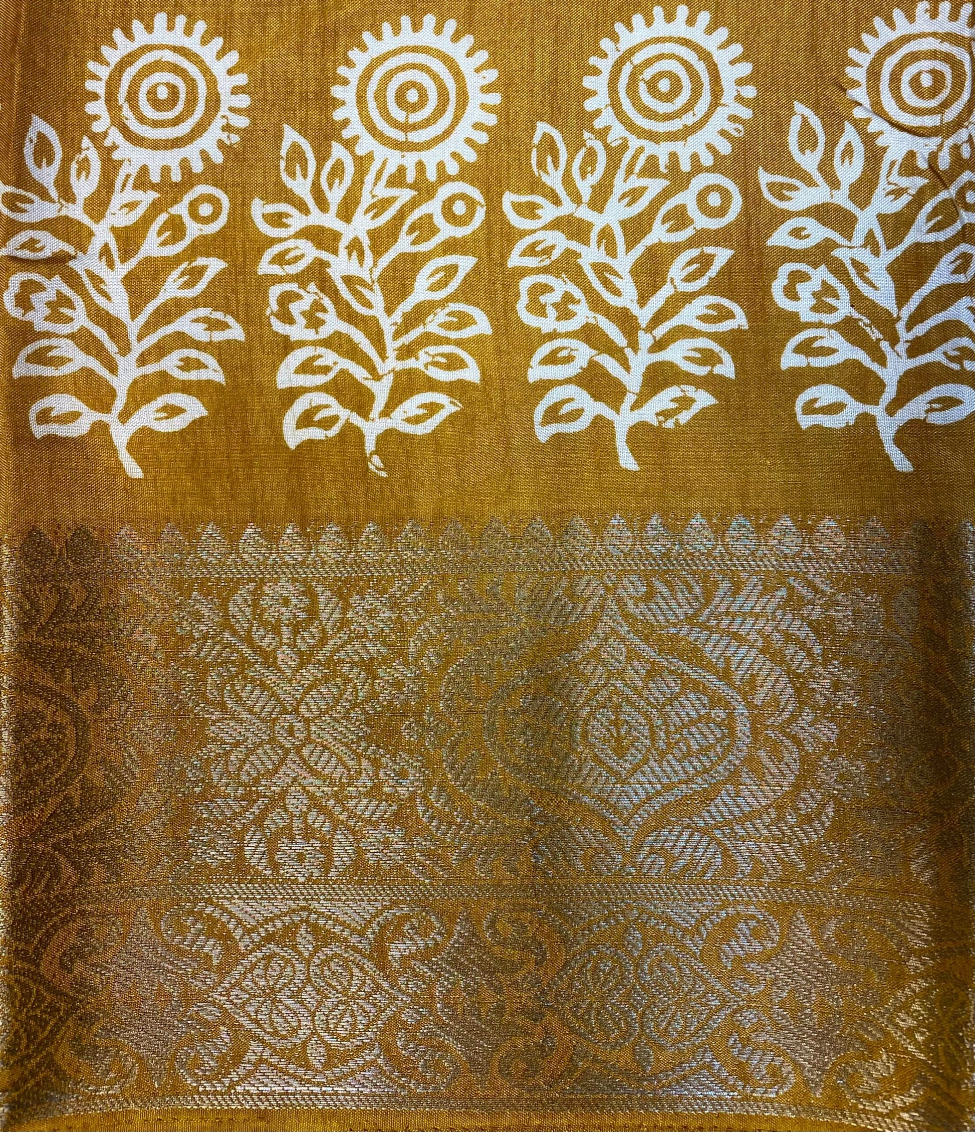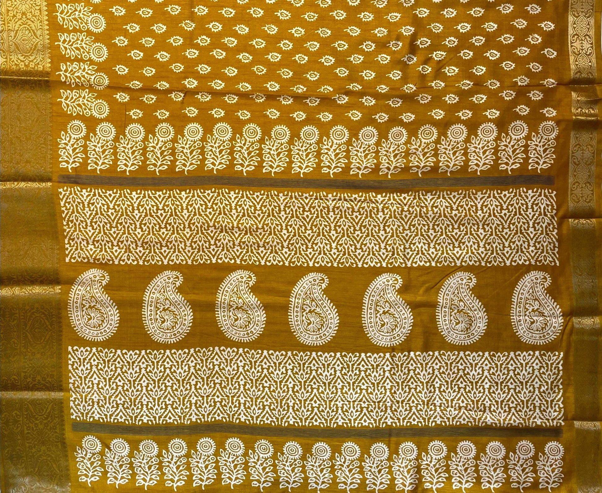 Yellow Viscose Silk Khadi Print Zari Border with Body and Pallow Design